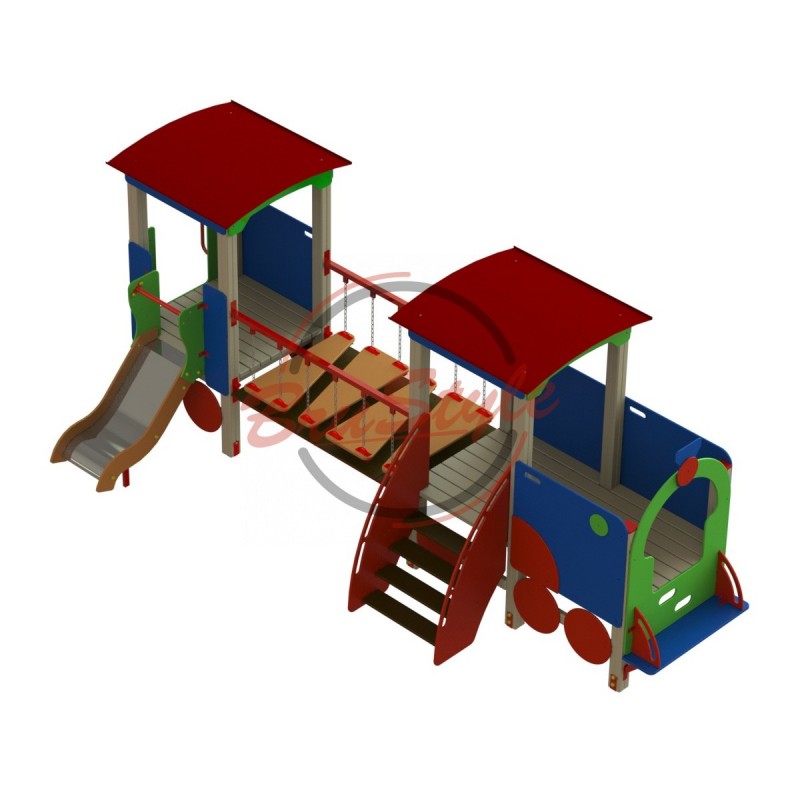 Гімнастичний комплекс "Паровозик з вагончиком" DIOS404 - це цікавий та багатофункціональний ігровий елемент для дитячого майданчика улюблений усіма дітьми, який принесе користь та радість Вашій дитині. Призначений для дітей віком від 3 до 7 років. Це чудовий варіант як для приватних будинків, так і для дитячих майданчиків. До комплексу входять дві кабіни з фанери, які з'єднані сходами на металевих ланцюгах. Також у комплексі є маленький спуск. Для безпечного гальмування ділянка ковзання із вертикального переходить у горизонтальне. Кабіни встановлені кожна на 4-х дерев'яних балках, завдяки яким можна регулювати висоту підлоги в кабіні (встановити на дитячий майданчик або закопати ніжки в землю). У паровозик можна увійти трьома шляхами: звичайними дерев'яними сходами, сходами з металевих труб, або залізти сходами фанерного лаза. Вся конструкція виконана з дерева та вологостійкої фанери. Наш завод завжди дбає про безпеку маленьких користувачів, тому всі матеріали лише з високоякісних матеріалів, металевих та дерев'яних компонентів. Гімнастичний комплекс покритий високоякісною емаллю найкращих європейських виробників. Металеві елементи покриті порошковими фарбами стійкими до погодних умов. Усі металеві частини спуску мають порошкове покриття, сидіння виготовлені із ламінованої фанери. Метизи, що використовуються, повинні бути оцинкованими і захищені антивандальними ковпачками.