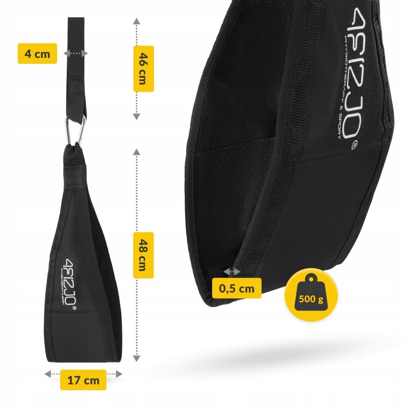 Підвісні петлі від 4Fizjo вирізняються міцною, першокласною обробкою та високоякісними матеріалами. Ці спортивні аксесуари виконані з дуже тривкого нейлону, який характеризується підвищеною стійкістю до розривів. Дві широкі плечові лямки додатково покриті м'якою піною з середини, що забезпечує комфорт під час занять. Їхня особлива конструкція запобігає натиранню та тиску, то ж ви можете повністю сконцентруватись на виконанні вправи. Більше того, набір включає карабіни та ремені для легкого кріплення інвентарю до перекладини чи підвісу. Не залежно від того професіонал ви чи любитель, тренуєтесь в залі чи вдома, переконайтесь самостійно на скільки ефективний даний аксесуар.