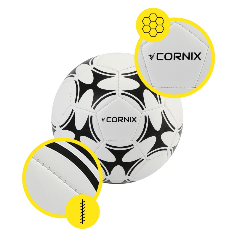 Футбольний м’яч від Cornix виготовлений з високоякісного термопластичного поліуретану (TPU) товщиною 3.5 мм, що забезпечує оптимальну витривалість та стійкість до деформації навіть під час інтенсивного використання. Гладка поверхня покращує аеродинамічні властивості та дозволяє краще контролювати снаряд під час дриблінгу, ударів або передач. Розмір 5 (діаметр 21.5 см) та вага 400-420 грамів повністю відповідають стандартам FIFA, забезпечуючи стабільність польоту та комфорт під час гри. Внутрішня бутилова камера зберігає оптимальний тиск, що гарантує м’який відскок і тривалий термін служби. Ручна зшивка панелей виконана з увагою до деталей та контролем на кожному етапі: від натягу нитки до щільності з'єднання.