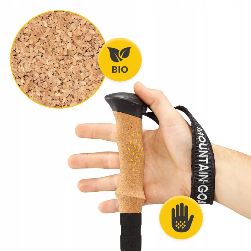 Трекінгові палиці від Mountain Goat виконані з вуглецевого волокна (карбону), матеріалу, який поєднує в собі надзвичайну міцність та мінімальну вагу (комплект лише 0.48 кг). Палиці мають 3-секційну конструкцію на основі просунутої Z-системи складання, в розібраному вигляді їх довжина всього 38 см. Для зручності використання на палицях нанесена шкала, завдяки чому користувач з легкістю зможе встановити потрібну висоту в діапазоні від 110 до 130 см та зафіксувати положення надійними замками Safe Lock. Рукоятки мають ергономічну форму та виконані з натурального пробкового дерева. Матеріал надзвичайно гігієнічний, запобігає натиранню шкіри й дозволяє їй вільно дихати. Форма рукояті адаптується до руки, що забезпечує надійний та міцний хват.
