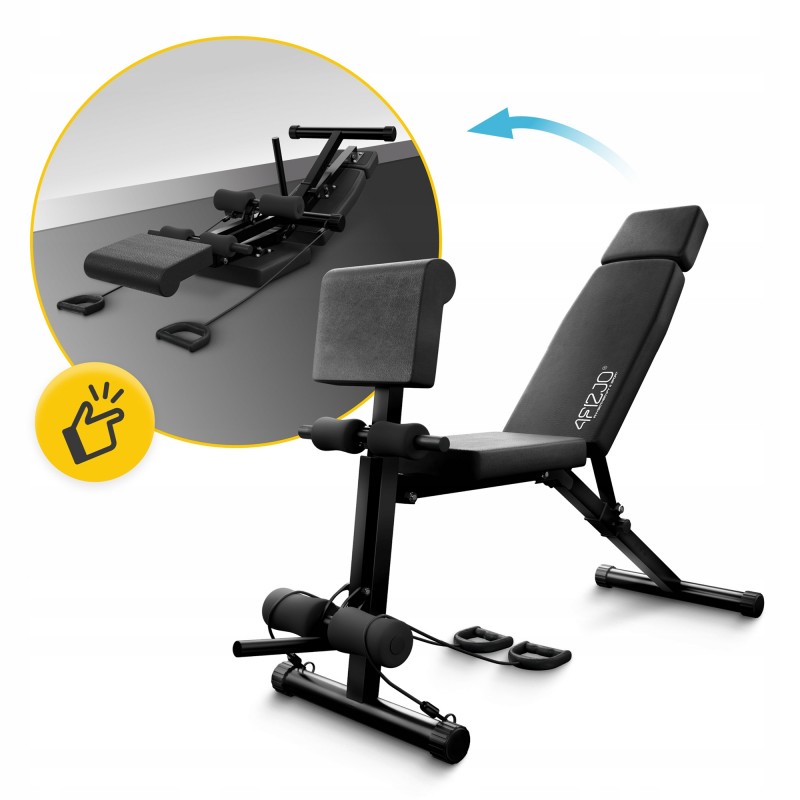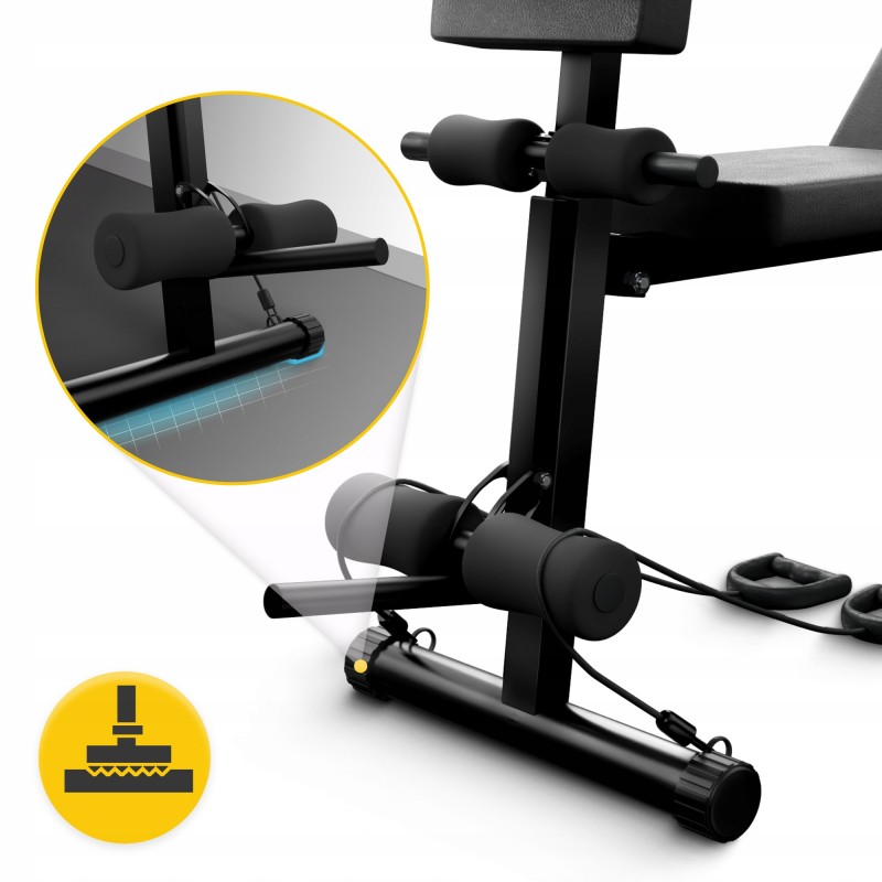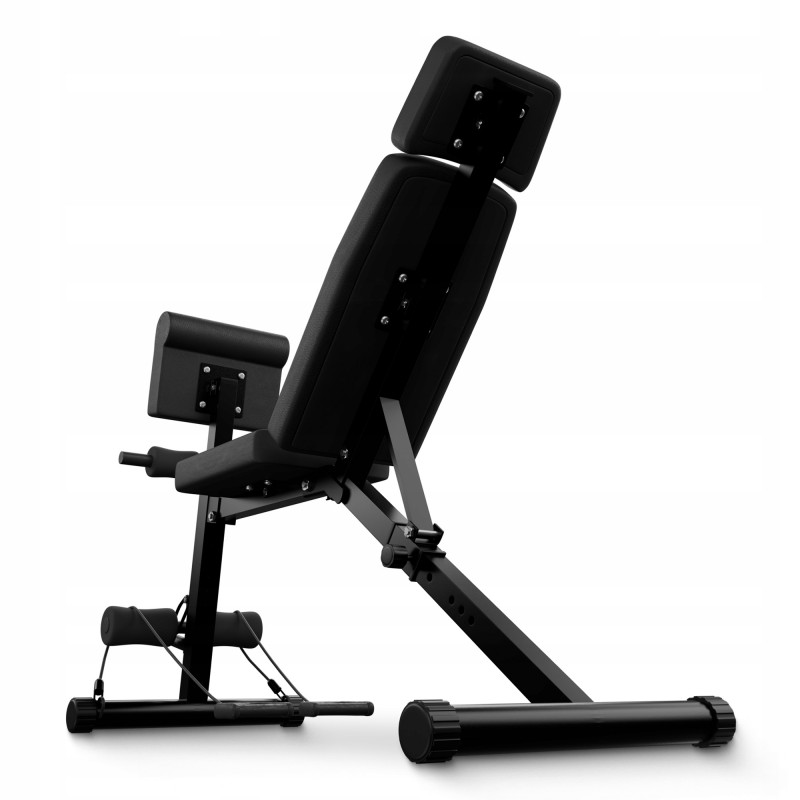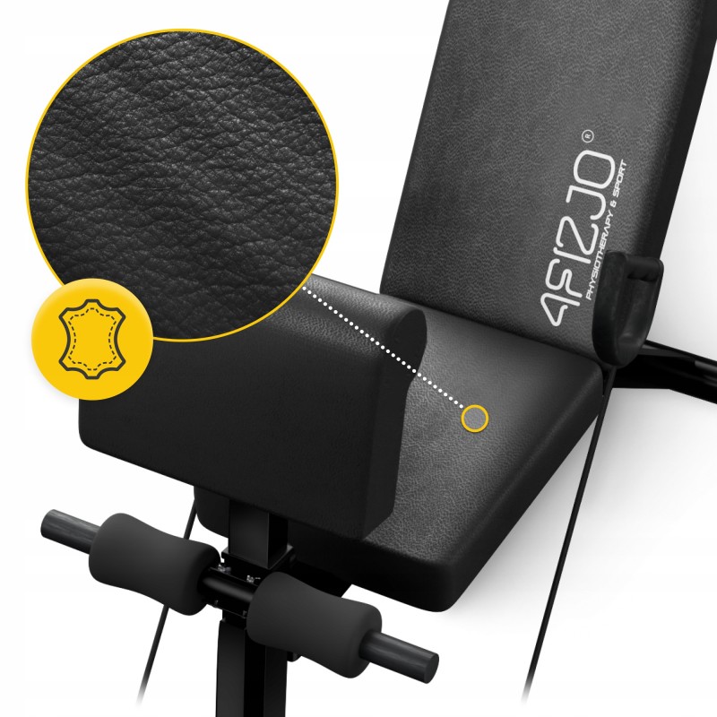 Рама багатофункціональної лави для тренувань від 4Fizjo виконана з високоякісного сталевого профілю, тому максимальне навантаження на неї становить до 230 кг. Тренажер оснащений системою зміни кута нахилу, завдяки чому спинку можна регулювати у 7-ми положеннях. Додатково в розпорядженні користувача парта Скотта зі змінною висотою та важіль для жиму ногами. Якісна та приємна на дотик оббивка з екошкіри наповнена стійкою до деформації, м'якою піною, що гарантує комфорт використання. Гумові ніжки з антиковзкою структурою забезпечать хорошу стійкість інвентарю. Ще однією перевагою даної тренувальної лави є можливість складання. Закінчивши тренування ви можете з легкістю сховати її в зручному місці, наприклад, під ліжком або за шафою.