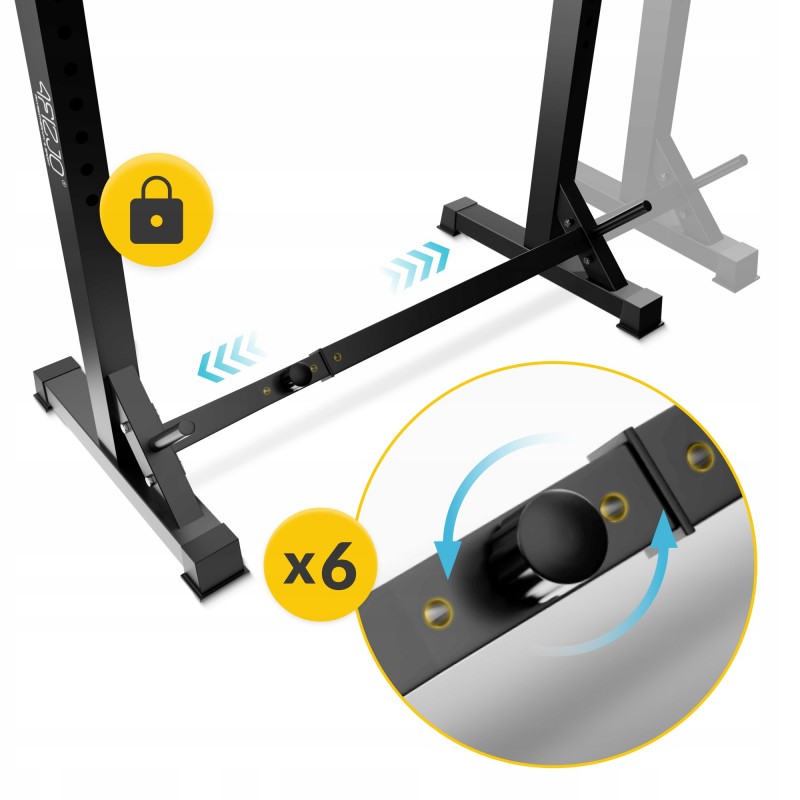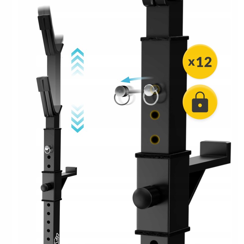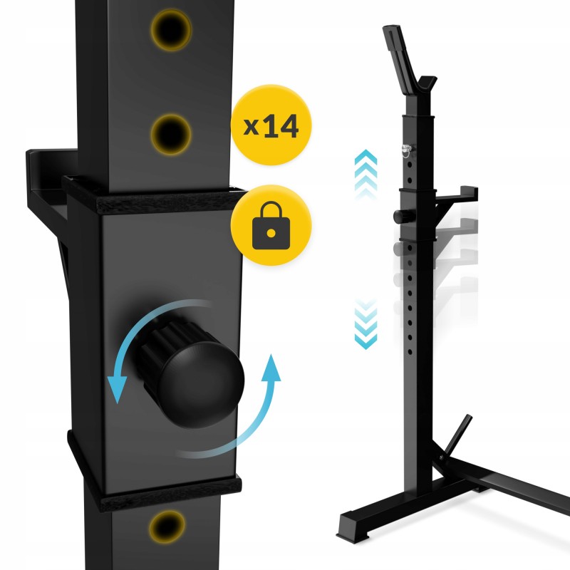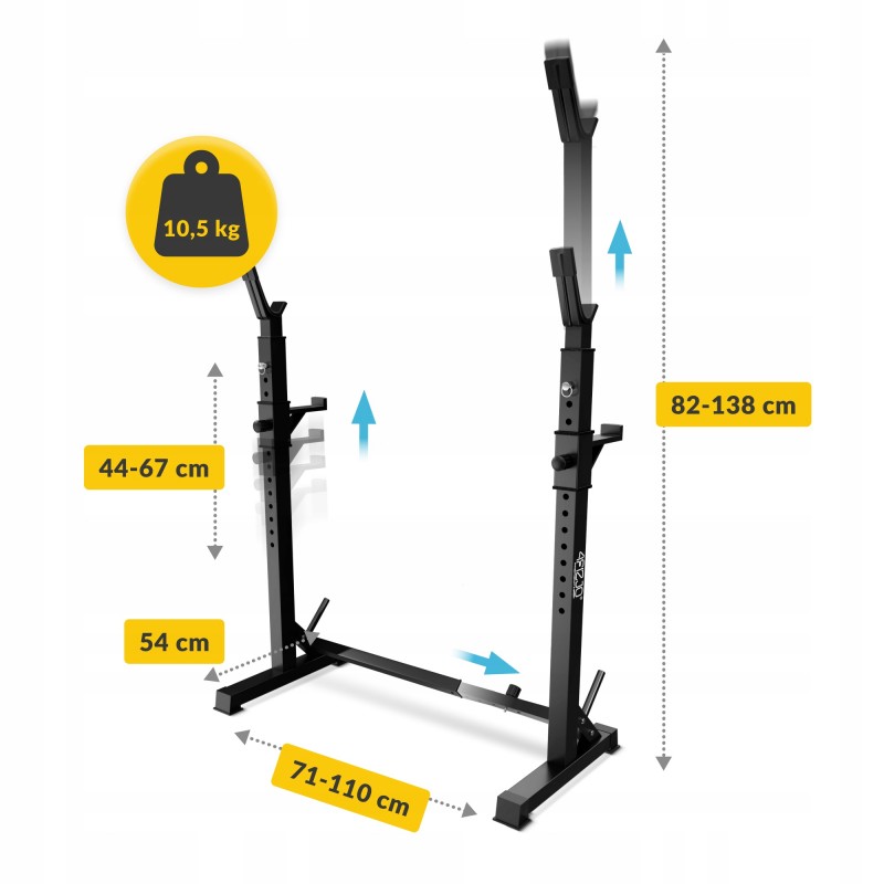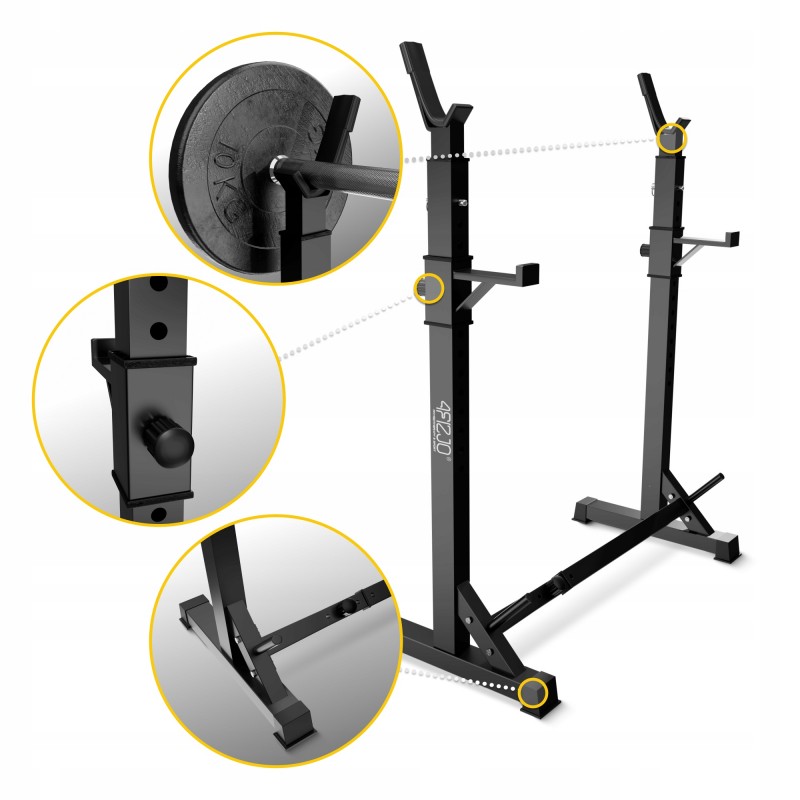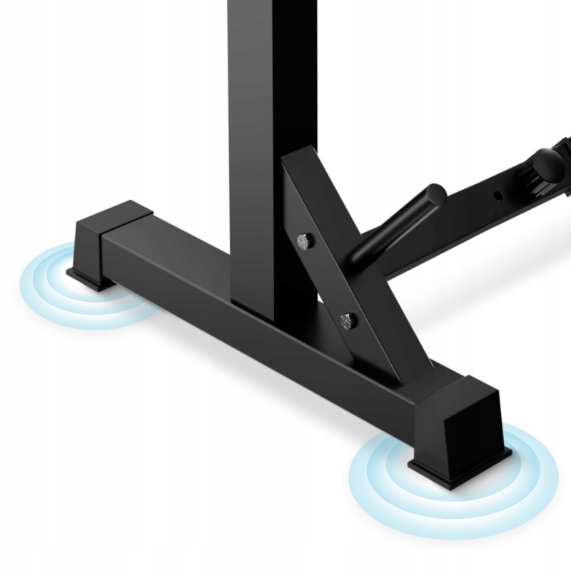 Стійки для штанги від 4Fizjo виконані з високоякісного сталевого профілю, тому максимальне навантаження на них становить до 200 кг. Інвентар оснащений системою регулювання, завдяки чому його висоту можна змінювати в межах від 82 до 138 см. Додатково виріб обладнаний страхувальними гачками, висота яких також регулюється. Профільована основа Н-подібної форми гарантує високий рівень стійкості, навіть під час тренувань з великими вагами. Ви також можете не турбуватися про пошкодження підлогового покриття, адже гумові накладки на основі надійно захистять будь-який тип підлоги. Важливою перевагою даної моделі є можливість зміни відстані між стійками, це дає змогу легко адаптувати їх на будь-яку довжину штанги, а після завершення тренування переставити в зручне місце для зберігання.