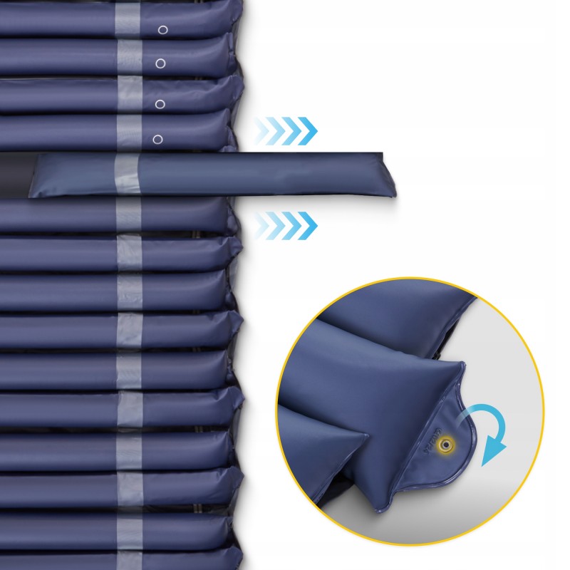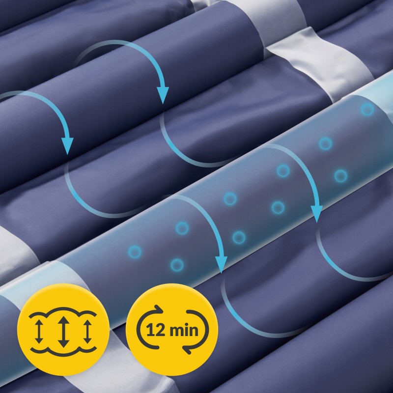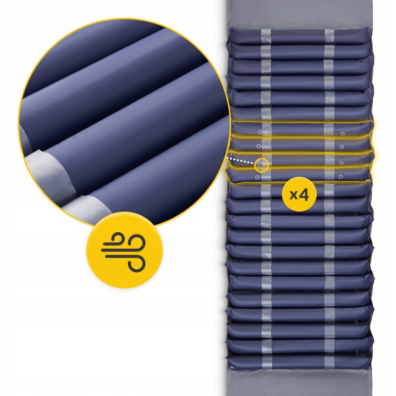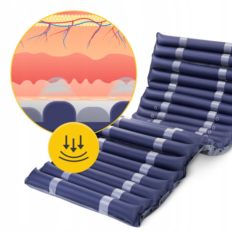 У комплекті присутній компресор змінного тиску. Рівень шуму, який він видає, складає приблизно 35 дБ, що значно нижче, ніж при звичайній розмові (50-60 дБ). Крім того, завдяки використанню гумових ніжок, вібрація приладу була зведена до мінімуму. Компресор надзвичайно простий в управлінні, тиск змінюється ручним регулятором відповідно до ваги пацієнта. Робота матраца заснована на поперемінному надуванні та спусканні 22 камер в циклі тривалістю 12 хв. Даний прийом створює ефект руху, що стимулює м'які тканини й таким чином запобігає постійному тиску на шкіру в одних і тих же місцях. Цей тиск може перешкоджати правильному кровотоку та лімфі, що призводить до розвитку хворобливих пролежнів. На додачу 4 з 22 камер містять систему мікровентиляції, яка покращує потік повітря та забезпечує кращу циркуляцію між матрацом і тілом людини. Прямих протипоказань до застосування протипролежневого матраца немає. Пацієнтам, які страждають на алергію, слід ознайомитися зі складом матеріалів, з яких він виготовлений. Перед використанням продукту рекомендується проконсультуватися з лікарем.