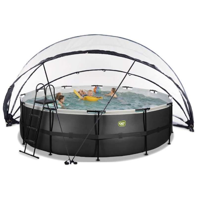 Басейн каркасний з накриттям Exit "Чорна шкіра" 450х122 см з нагрівом води (піщаний фільтр) виглядає лаконічно і елегантно. Із зовнішнього боку - тканина з ефектом чорної шкіри, що зробить його розміщення в саду, на дачі або у дворі будинку особливо естетичним. У стандартну комплектацію входить насос з піщаним фільтром, сходи для басейну і купол (накриття для басейну Exit Eco ø550 см. .
