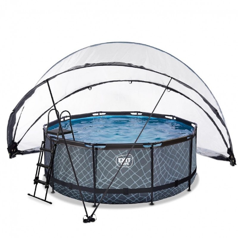 Басейн каркасний з накриттям Exit "Камінь" 360х122 см з нагрівом води (піщаний фільтр) виглядає лаконічно і елегантно. Із зовнішнього боку - тканина із забарвленням у вигляді кам'яної стіни, що зробить його розміщення в саду, на дачі або у дворі будинку особливо естетичним. У стандартну комплектацію входить насос з піщаним фільтром, сходи для басейну і купол (накриття для басейну Exit Eco ø550 см. .