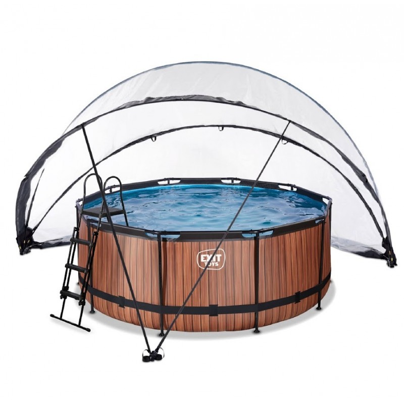 Басейн каркасний з накриттям Exit "Дерево" 360х122 см з нагрівом води (піщаний фільтр) виглядає лаконічно і елегантно. Із зовнішнього боку - тканина із забарвленням у вигляді дерев'яної стіни, що зробить його розміщення в саду, на дачі або у дворі будинку особливо естетичним. У стандартну комплектацію входить насос з піщаним фільтром, сходи для басейну і купол (накриття для басейну Exit Eco ø460 см. .