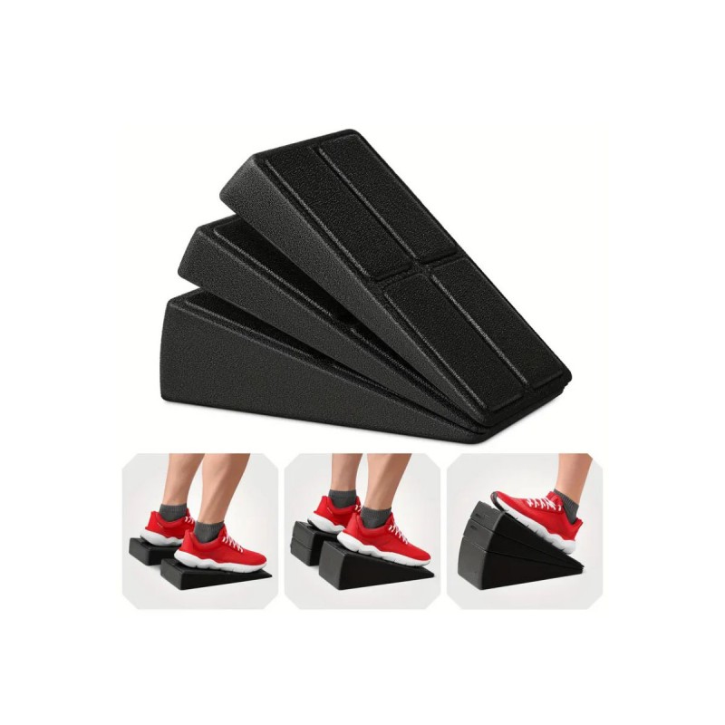 Клиновий блок для присідань EasyFit — це спеціальний регульований тренувальний аксесуар, що складається з набору з трьох похилих платформ, призначених для покращення техніки виконання присідань і роботи над поставою. Унікальність набору полягає в комплектації трьома блоками з різними кутами нахилу, що допомагає урізноманітнити тренування, покращити стійкість і глибину амплітуди рухів під час присідань.