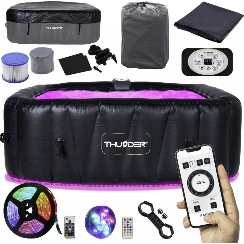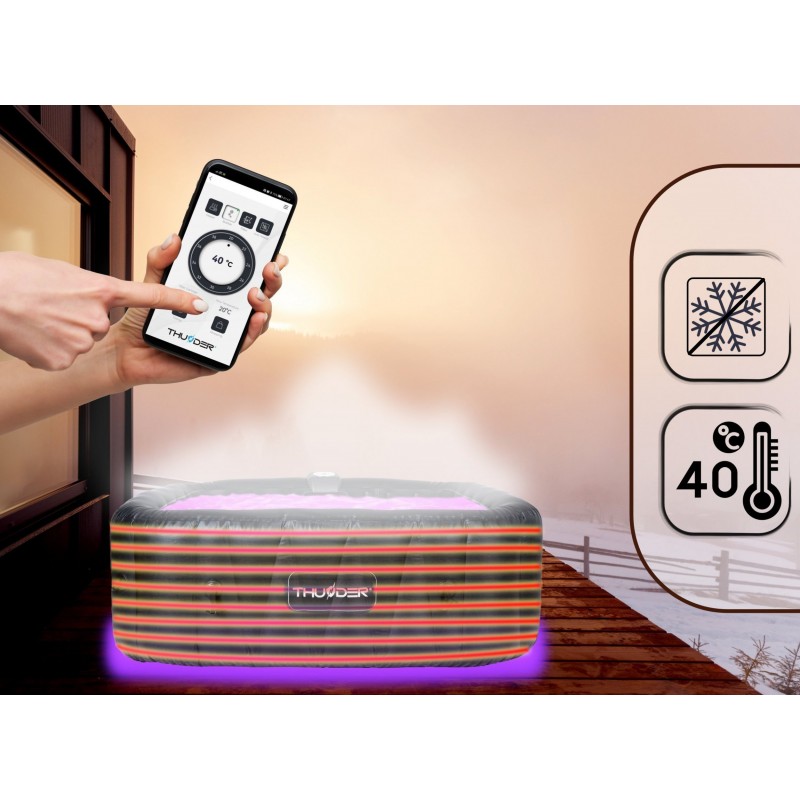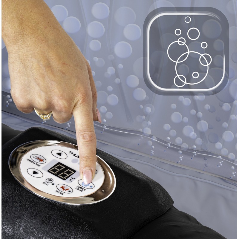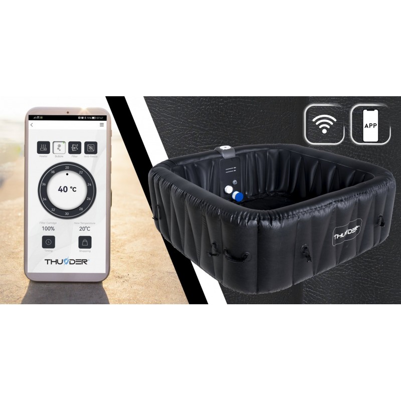 Керуйте надувним джакузі Thunder®️ DOPPIO зі свого смартфона!Дистанційне керування з мобільного додатку – одна з переваг джакузі Thunder®️ DOPPIO. Завдяки спеціально розробленому додатку користувачі можуть зручно контролювати та регулювати налаштування . Переваги цього рішення численні. По-перше, це забезпечує комфорт і зручність використання. Вам не потрібно вставати, щоб налаштувати параметри води під свої потреби! Крім того, дистанційне керування дозволяє користувачам готувати ванну заздалегідь . Ви можете дистанційно ввімкнути підігрів води або гідромасаж перед входом у нього, щоб насолоджуватися готовим і ідеально підготовленим джакузі. Крім того, дистанційне керування дозволяє відстежувати стан джакузі , наприклад температуру води та рівень чистоти, що дозволяє користувачам належним чином підтримувати та обслуговувати пристрій. Завдяки цьому рішенню надувний SPA Thunder®️ DOPPIO стає ще більш функціональним і адаптованим до потреб користувачів.