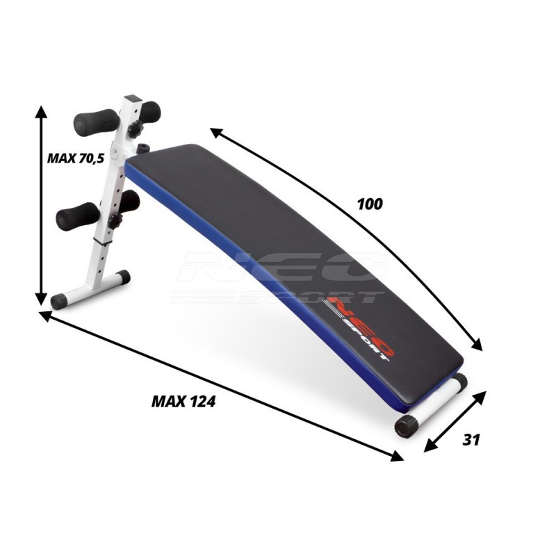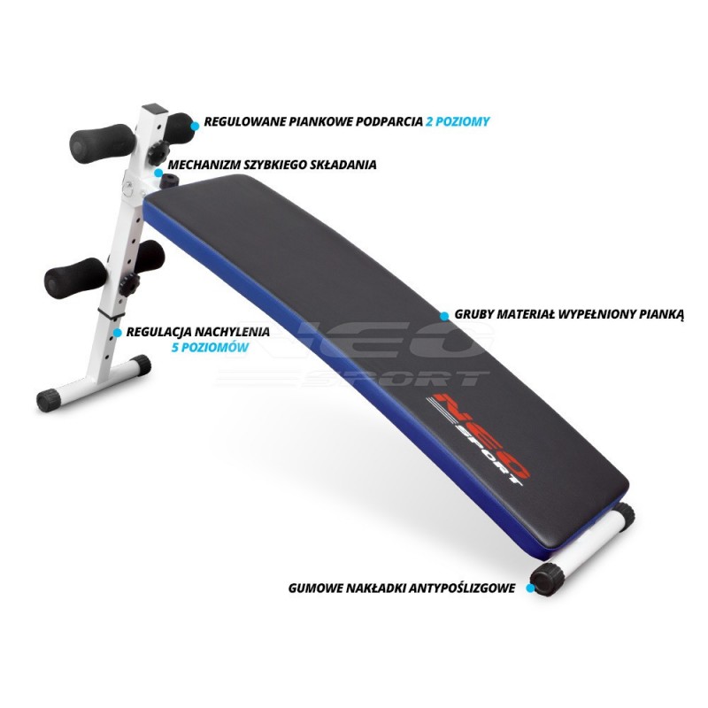 Похила лава для вправ на м'язи животаМи представляємо вам розширений профіль Neo-Sport, призначений для домашніх тренажерних залів і багато іншого. Наша лава має регульовану висоту ноги, яка відповідає за нахил сидіння. Завдяки гумовим кінцях підстав немає ризику дряпати домашній підлогу. Сильно зшиті у привабливих кольорах і товста піна для сидіння забезпечують максимальний комфорт як для тренування нижній і верхній м'язів.Стабільна металева конструкція забезпечує безпеку і максимальну стабільність при використанні лави. Регулювання висоти ніжки дає вам повну свободу встановлення обладнання у відповідності з вашим власним стилем і набором вправ. Завдяки швидкому складному механізму, лава, коли вона складається в плоскому положенні, займає дуже мало місця.Будівництво лави: