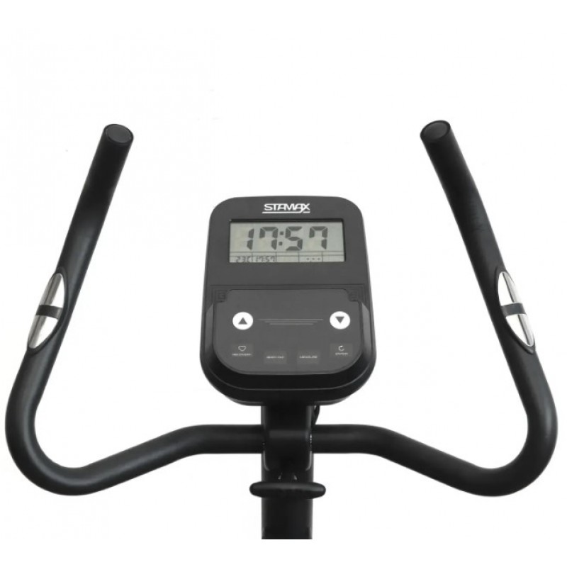Велотренажер Stamax Ultra оснащений зручним LCD-дисплеєм, що відображає всі ключові параметри тренування. У режимі реального часу на екрані показуються час заняття, поточна швидкість, пройдена дистанція, витрачені калорії, а також частота пульсу. Датчики пульсу вмонтовані в ручки керма: достатньо покласти долоні на сенсори, і прилад почне зчитувати ваш пульс. Контроль частоти серцевих скорочень дозволяє тренуватися в оптимальній кардіозоні для спалювання жиру чи зміцнення серця.