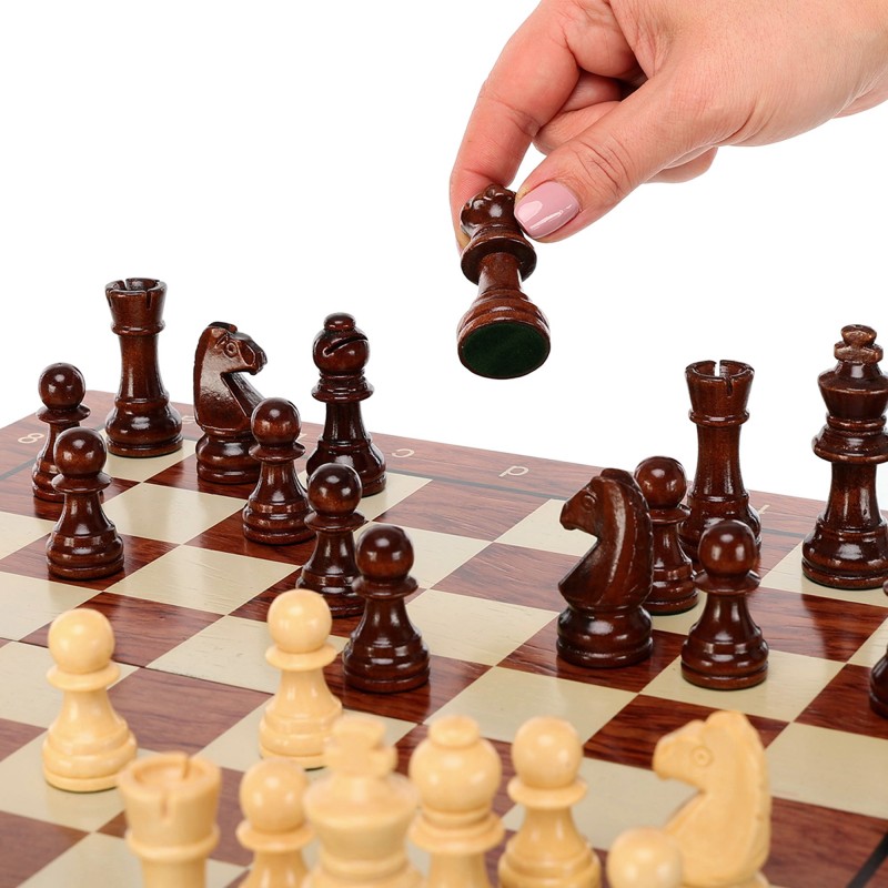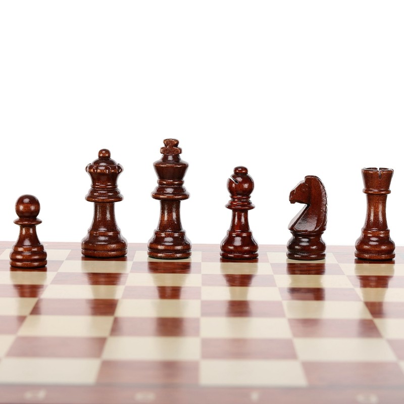 Фігури шахів виконані з дерева і мають класичну форму, що робить гру не лише зручною, а й візуально естетичною. Король має висоту 6 см і діаметр основи 2.3 см, а пішака – 3.5 см та 1.9 см відповідно. Кожна фігура приємно лягає в руку, забезпечуючи комфортне пересування дошкою.