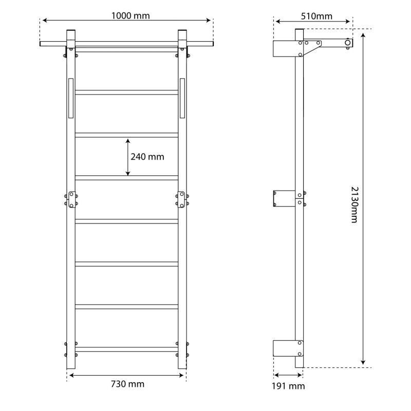 З метою безпеки під час виконання вправ драбину потрібно прикріпити до стіни за допомогою 12 гвинтів, що входять до комплекту. Драбина кріпиться до шести кронштейнів, тому ви можете бути впевнені, що обладнання витримає і динамічні вправи.