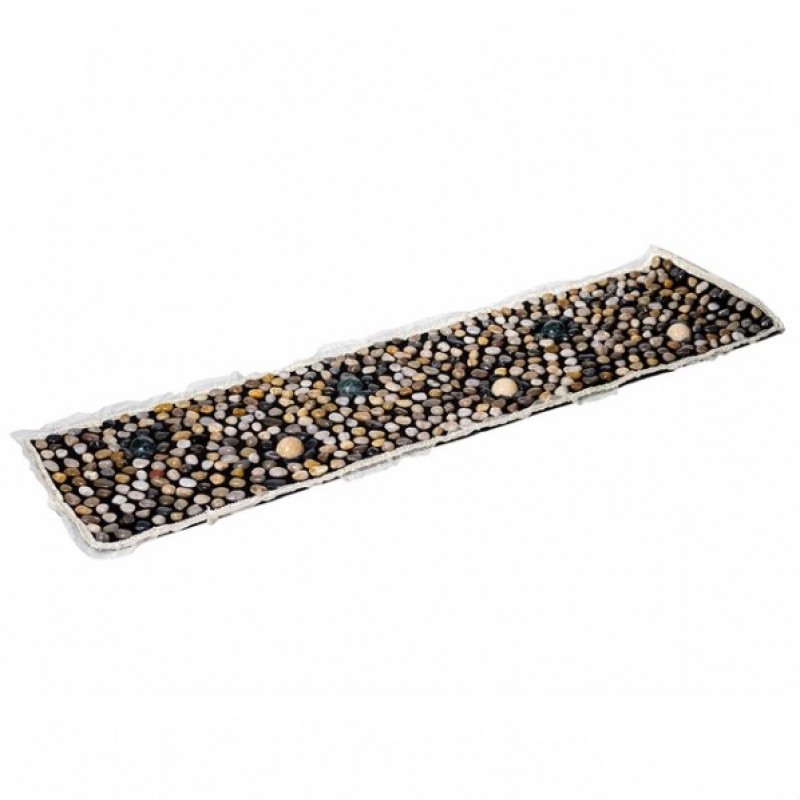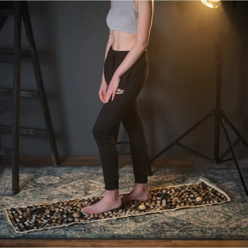Натуральна галька та 6 більших круглих каменів стимулюють акупресурні точки на стопах, покращуючи кровообіг, знімаючи м’язову напругу та зміцнюючи стопи. Килимок легко зберігати, ним можна користуватися як сидячи, так і стоячи.