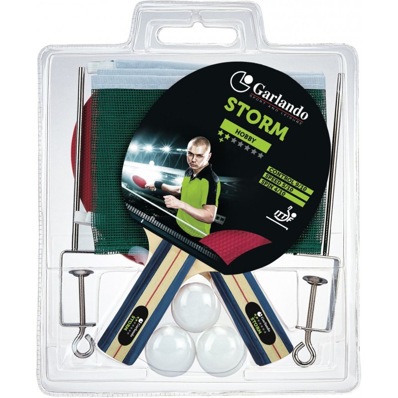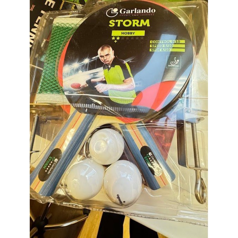 У комплект постачання входять: 2 ракетки для настільного тенісу Garlando Storm Plus, 3 м'ячі білого кольору і сітка для настільного тенісу з універсальним гвинтовим кріпленням.