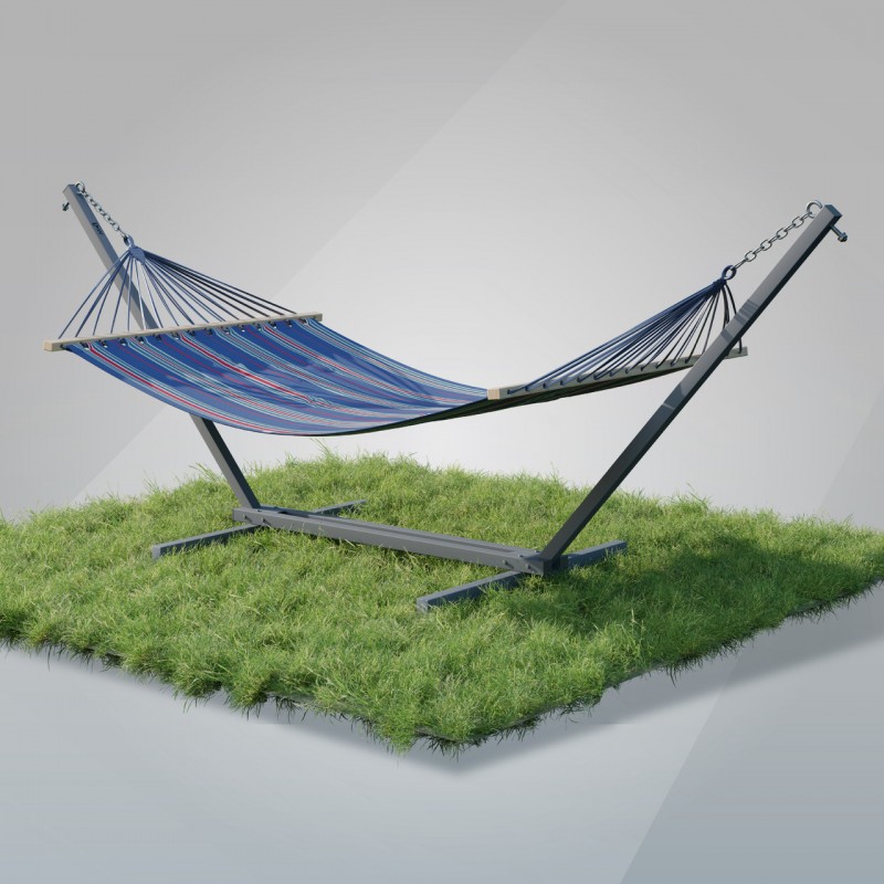 Сталевий каркас для гамака виготовлений з металевого профілю 50х50, що робить його зовнішній вигляд масивнішими, а конструкцію міцною та стійкою. Також стійка для гамака комплектується всіма потрібними елементами для кріплення гамака (гаки м12, карабіни М10 та ланцюги )