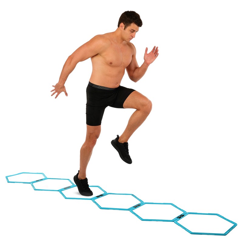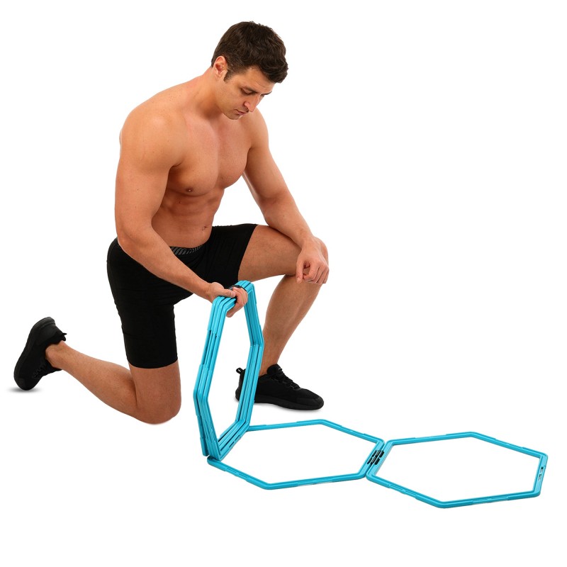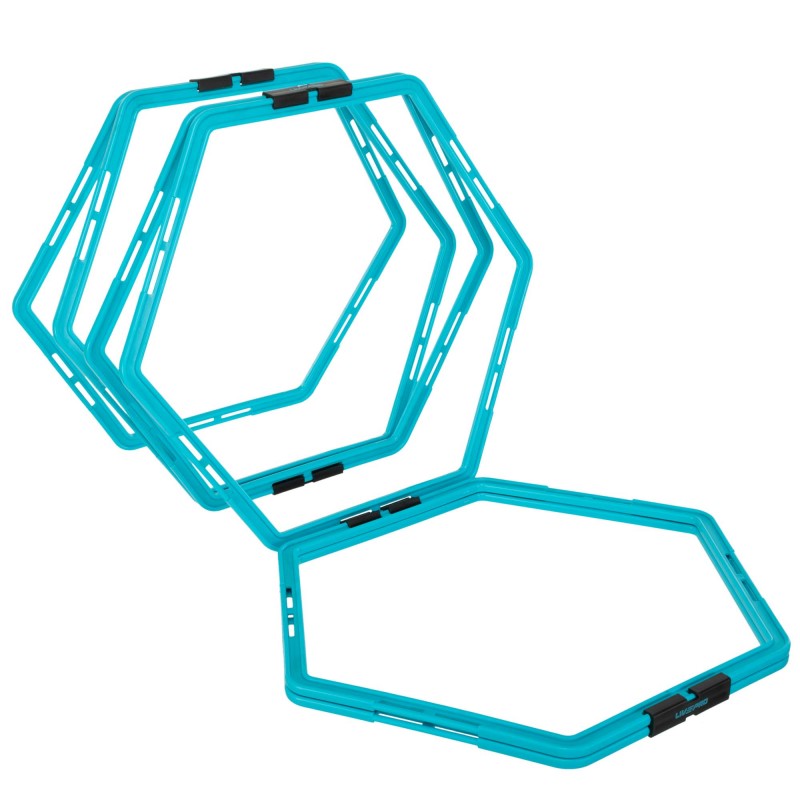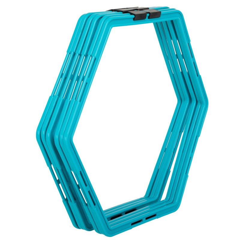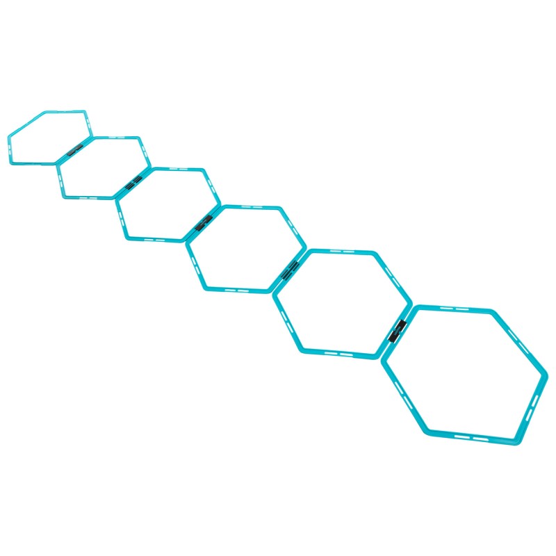 Тренувальна підлогова сітка Agility - координаційні сходи для тренування швидкості, спритності та балансу. Тренажер виконаний у вигляді 6 ідентичних шестикутників з високоміцного пластику. Соти дуже легкі, за допомогою універсальних кріплень їх можна вільно комбінувати. Матеріал стійкий до впливу зовнішнього середовища, відмінно справляється з навантаженнями, не деформується. Довжина сторони соти - 28 см, товщина рами - 11 мм. У складеному вигляді конструкція не займає багато місця, вага одного комплекту (6 штук) становить лише 1,3 кг. Це дає змогу з легкістю переносити тренажер, використовувати його для тренувань у залі та на вулиці.