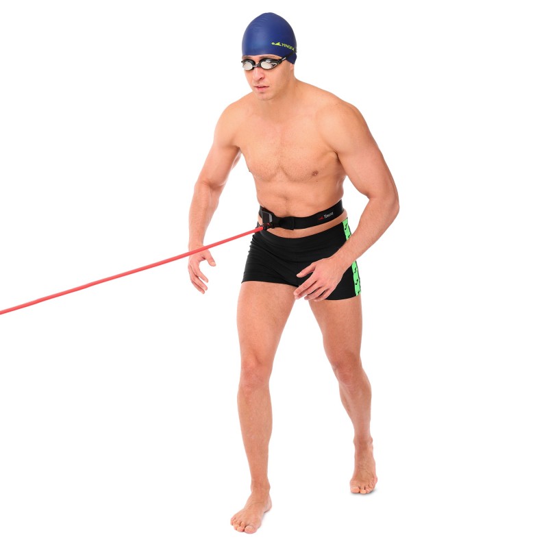 Використання поясного тренажера неймовірно зручне. Пояс довжиною 1 метр та шириною 5,5 см надійно фіксується на талії, рівномірно розподіляючи навантаження та не створюючи дискомфорту. До нього кріпиться еластичний джгут, який можна закріпити на борту басейну або спеціальної станції, створюючи опір, що змушує плавця активніше працювати руками та ногами. Такий метод тренування допомагає покращити силові показники, а також коригувати техніку плавання за рахунок стійкого опору.