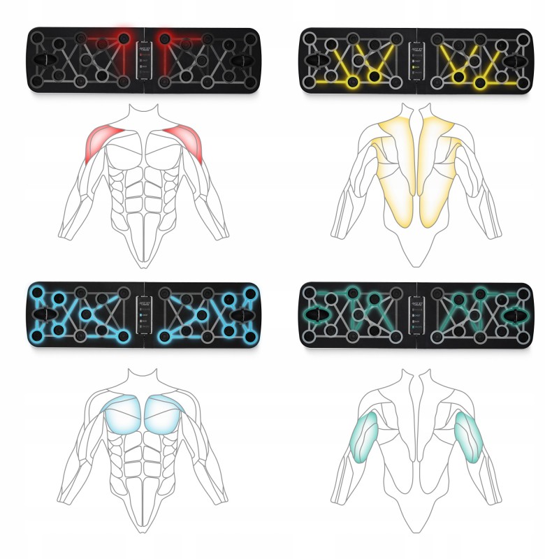 Платформа для віджимань від 4Fizjo виконана з ABS пластику, завдяки чому інвентар надзвичайно міцний. Знімні рукоятки мають нековзке покриття для надійності хвату. Унікальною особливістю нашого виробу є 22 отвори (по 11 з кожного боку), які дозволяють встановлювати ручки в багатьох положеннях, що відрізняються не тільки відстанню, але й кутом. Крім того, усі отвори були розділені на 4 групи, відповідно до м'язів на які робиться акцент (руки, спина, груди чи трицепси) та промарковані окремим кольором. Це рішення не тільки надає безліч варіантів вправ, але й забезпечує контроль над тренуванням та рівномірний розвиток усіх м'язів. І як додаток, можливість складання дошки навпіл, полегшує транспортування та зберігання обладнання, навіть у не великому просторі.