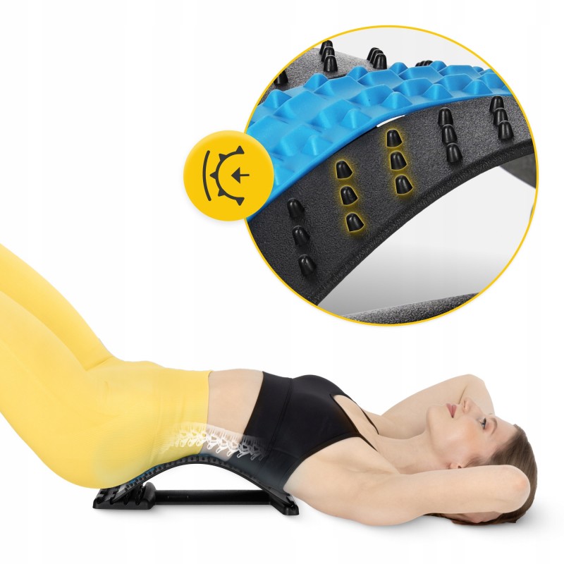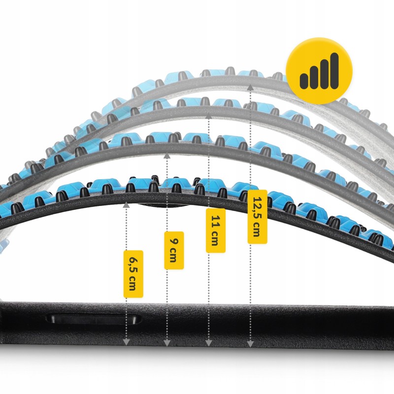 Тренажер для розтягування спини від 4Fizjo являє собою дугу, що виконана з гнучкого пластику. Користувачеві доступно 4 рівні регулювання висоти, які впливають на інтенсивність витягування та підтримки попереку. Крім того, панелі виробу оснащені точковими виступами для ефективного масажу ділянки вздовж хребта. Така проста та пасивна терапія дасть змогу плавно розтягувати центральний хребетний стовп, знімаючи напругу й усуваючи біль. Даний тренажер не потребує надмірних зусиль для його використання, він компактний, тому не займе багато простору. Щойно вам знадобиться розминка для хребта, просто покладіть його на підлогу й він буде готовий до використання.