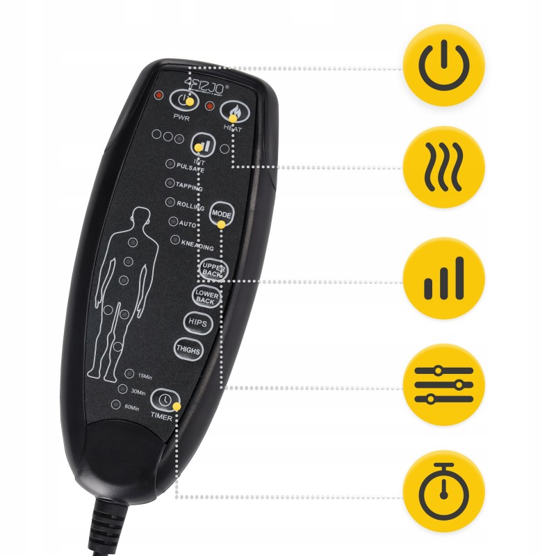 Завдяки різноманітності налаштувань ви можете підлаштувати все під себе: вимкнути або ввімкнути кожну масажну зону для будь-якого із режимів, активувати підігрів, обрати рівень інтенсивності, а також встановити таймер на 15, 30 чи 60 хв. Керування пристроєм відбувається за допомогою пульта та є інтуїтивно зрозумілим. По завершенню масажу вимкніть прилад на пульті до наступного сеансу.