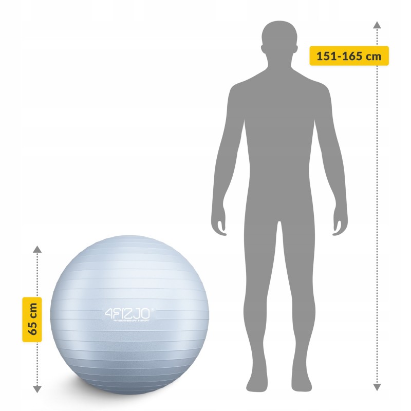 Гімнастичний м’яч від 4Fizjo виготовлений із щільного, екологічно безпечного матеріалу PVC, стійкого до подряпин і деформації. Розмір фітболу підбирається до зросту користувача, щоб забезпечити правильне положення тіла під час вправ: при сидінні стегна мають знаходитися вище за коліна, формуючи кут 90°. М'яч розрахований на високі навантаження та витримує вагу до 120 кг, навіть при інтенсивних тренуваннях. Гладка поверхня з антиковзким ефектом надає стабільності при динамічних рухах. Для оптимального результату перед першим використанням рекомендовано накачати м’яч до 80% об’єму, а через 24 години допомпувати до повного розміру - це дозволить матеріалу рівномірно розтягнутися. Комплект включає помпу зі зручною системою накачування Push and Pull, що спрощує підготовку до занять.