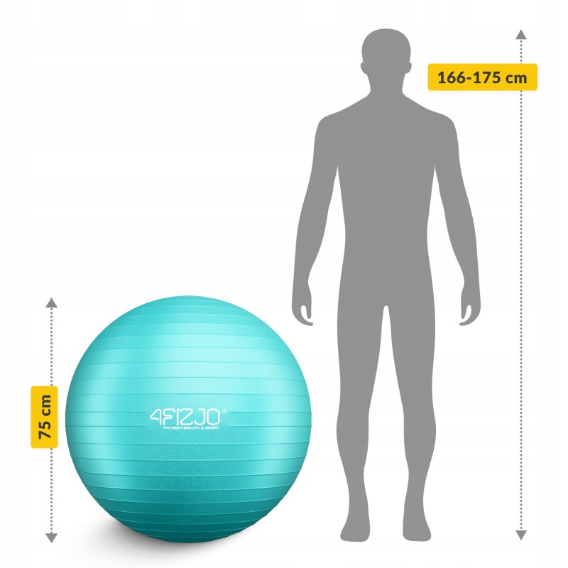 Гімнастичний м’яч від 4Fizjo виготовлений із щільного, екологічно безпечного матеріалу PVC, стійкого до подряпин і деформації. Розмір фітболу підбирається до зросту користувача, щоб забезпечити правильне положення тіла під час вправ: при сидінні стегна мають знаходитися вище за коліна, формуючи кут 90°. М'яч розрахований на високі навантаження та витримує вагу до 120 кг, навіть при інтенсивних тренуваннях. Гладка поверхня з антиковзким ефектом надає стабільності при динамічних рухах. Для оптимального результату перед першим використанням рекомендовано накачати м’яч до 80% об’єму, а через 24 години допомпувати до повного розміру - це дозволить матеріалу рівномірно розтягнутися. Комплект включає помпу зі зручною системою накачування Push and Pull, що спрощує підготовку до занять.