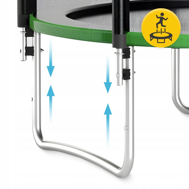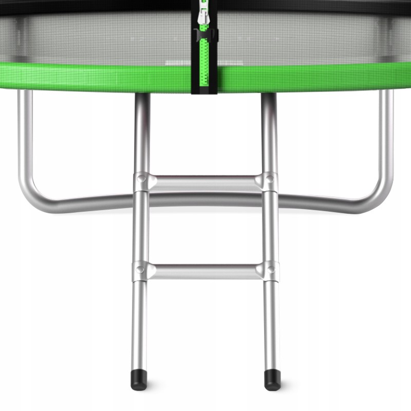 Батут від 4Fizjo виготовлений із високоякісних матеріалів. В основі каркас з оцинкованої сталі, стійкої до корозії та змін погоди, що гарантує довговічність навіть при інтенсивній експлуатації. Щільна сітка з поліетилену (PE) захищає від випадкового випадання, а її міцні шви та замки з м'якими прокладками додають надійності виробу. Стрибкове полотно виконане з поліпропілену високої якості, що гарантує відмінні експлуатаційні характеристики продукту. Гартовані стальні пружини, якими оснащений батут, створюють оптимальну динаміку під час стрибків та забезпечують м'яке приземлення. Ніжки у формі літери "U" роблять конструкцію надзвичайно стабільною, а комплектна драбина спрощує доступ на батут для найменших користувачів. Багатошарова накладка із ПВХ, що закриває пружини, виконує одразу кілька функцій: зменшує шум під час експлуатації, а також запобігає потраплянню одягу чи волосся у механізм.