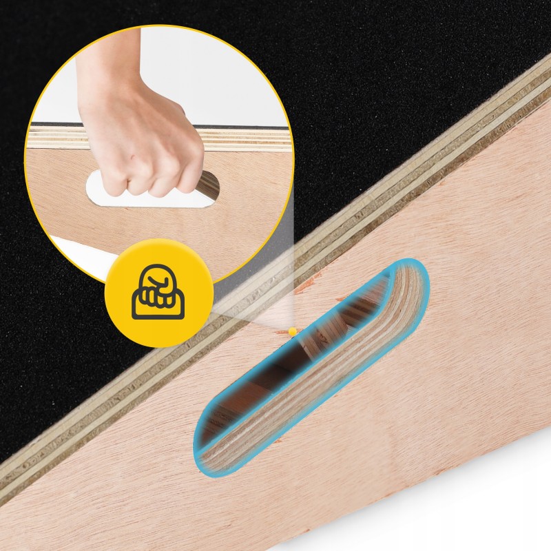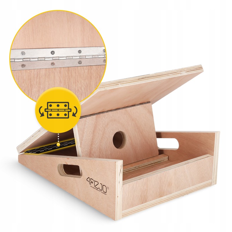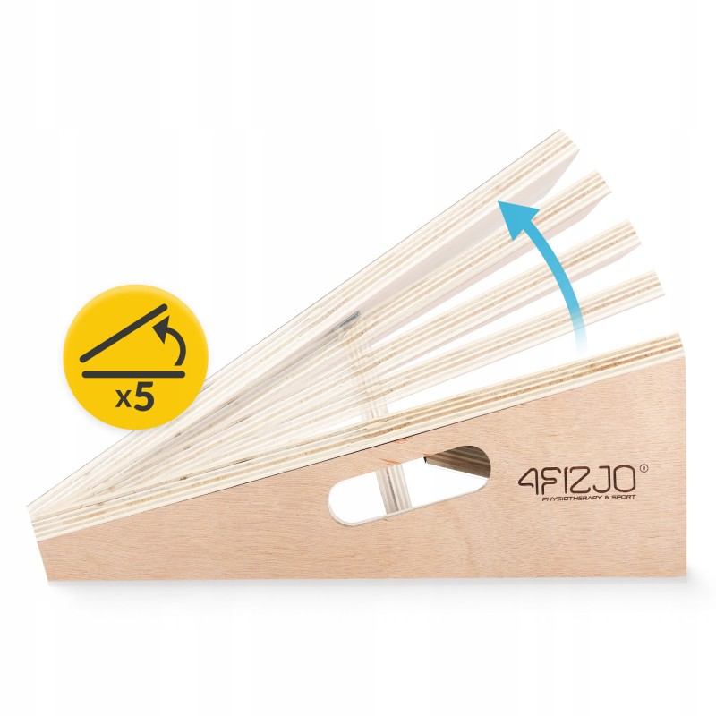 Клин-платформа 4Fizjo Slant Board виготовлена з міцної багатошарової деревини, тому з легкістю витримує навантаження до 150 кг, а протиковзке покриття забезпечує стабільність навіть під час найактивніших рухів. Розміри платформи (42 x 31.5 x 15.5 см) ідеально підібрані для зручного розміщення ніг, а система регулювання дозволяє змінювати кут нахилу від 15.5° до 35° - це відкриває можливості для поступового прогресу у розтяжці чи силових вправах. Високий рівень безпеки виробу досягається за рахунок стійкої конструкції та якісних матеріалів, які запобігають деформації навіть при тривалому використанні. А завдяки простій системі складання, платформу легко прибрати в шафу або взяти з собою на тренування.