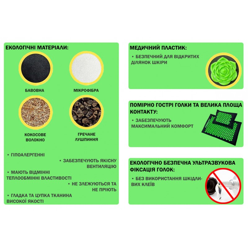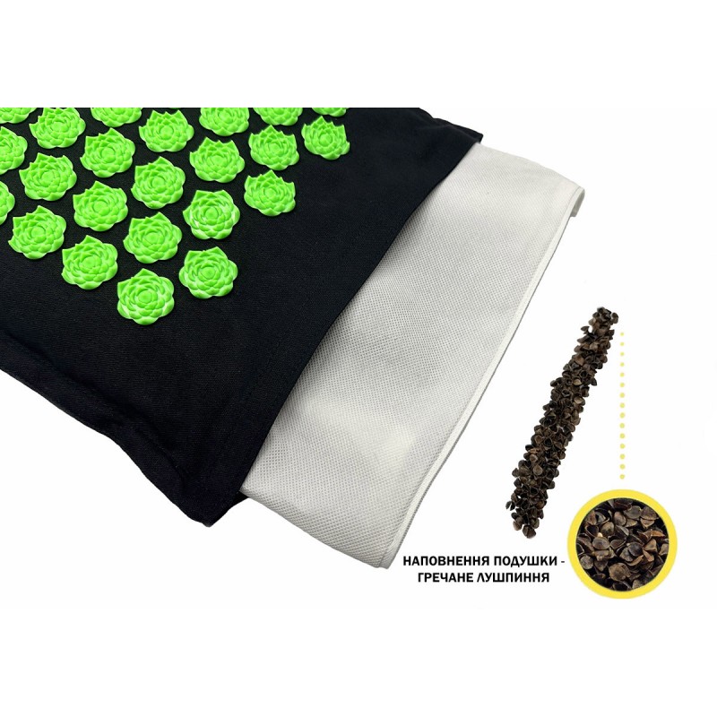 - Ортопедична подушка - наповнена натуральним гречаним лушпинням. Вона ідеально підтримує шию, поперек або стопи, а також може використовуватися окремо від килимка.