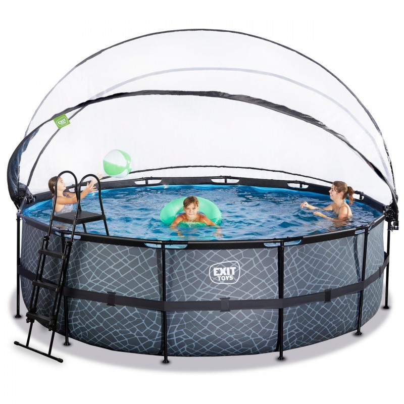 Басейн з куполом Exit камінь 488х122 см (пісочний фільтр) виглядає лаконічно і елегантно. Із зовнішнього боку - тканина із забарвленням у вигляді кам'яної стіни, що зробить його розміщення в саду, на дачі або у дворі будинку особливо естетичним. У стандартну комплектацію входить насос з піщаним фільтром і сходи для басейну.