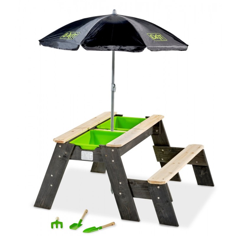 Стіл із лавкою для ігор з водою та піском Exit Aksent із сонцезахисною парасолькою – універсальний стіл для пікніка, піску та води