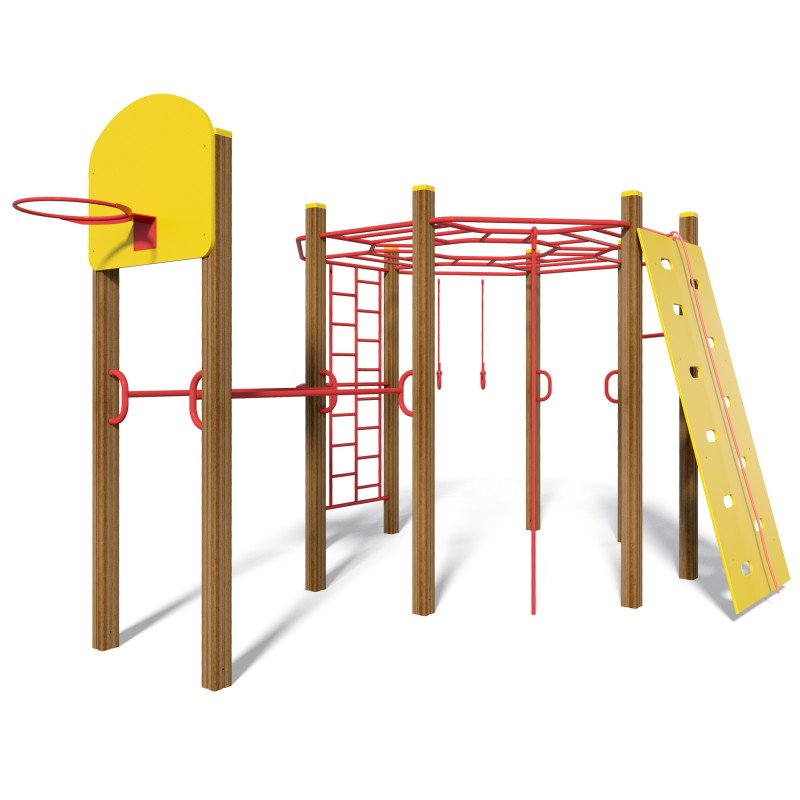 Гімнастичний комплекс "Атлет-1" InterAtletika S724 призначений для розвитку у дітей координації руху, а також для занять фізичними вправами на відкритому повітрі. Гімнастичний комплекс являє собою єдину конструкцію, яка складається з рукоходу, ліани-драбини, прямих сходів, брусів, дошки скелелаза, кілець, канату та баскетбольного щита, закріплених на дерев'яних брусах.