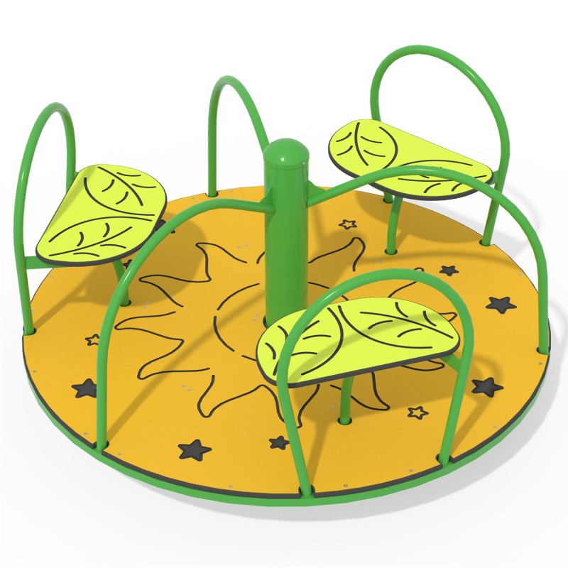 Каркас каруселі виконано з металевого профілю, а платформа і три сидіння – з надміцного HDPE пластику. Кожне сидіння обладнане спинкою, також виріб має три поручні, за які потрібно триматися, щоб не травмуватися під час розкручування. Обладнання відрізняється стійкістю до стирання, вигорання та механічних пошкоджень, яскраві кольори зберігають насиченість навіть протягом багатьох років активного користування. Елементи з металу покриті порошковою фарбою. Карусель не містить гострих кутів та деталей, через які може травмуватися дитина.