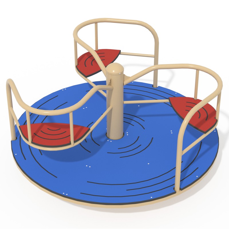 Каркас каруселі виконано з металевого профілю, а платформа і три сидіння – з надміцного HDPE пластику. Кожне сидіння обрамлене елементами з металу, що виконують функцію спинки та поручнів, за які дитина триматиметься під час гри. Обладнання відрізняється стійкістю до стирання, вигорання та механічних пошкоджень, яскраві кольори зберігають насиченість навіть протягом багатьох років активного користування. Елементи з металу покриті порошковою фарбою. Карусель не містить гострих кутів та деталей, через які може травмуватися дитина.