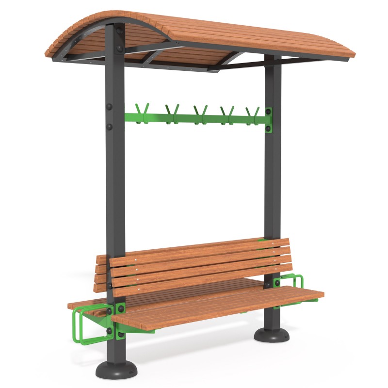 Лавка продумана до дрібниць і складається з двох надійних опор, до яких монтується навіс у верхній частині, двох зручних лавок зі спинками та по одному паркувальному місцю для велосипедів між лавочками. Також в конструкції обладнання передбачена вішалка для одягу, яка вмонтована горизонтально над лавкою. Відпочинок або очікування стає ще зручнішим та комфортнішим завдяки навісу, який захистить від дощу, снігу або палючих сонячних променів та комфортної лави зі спинкою.
