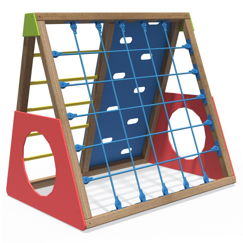 Ігровий гімнастичний комплекс "Павутинка" виконаний у формі трикутної піраміди. Міцний металевий каркас розрахований на високі навантаження, деталі надійно зварені між собою в єдину конструкцію. На обладнання нанесена акрилова фарба на водній основі, елементи з металу покриті порошковою фарбою. Покриття безпечне для використання дітьми.