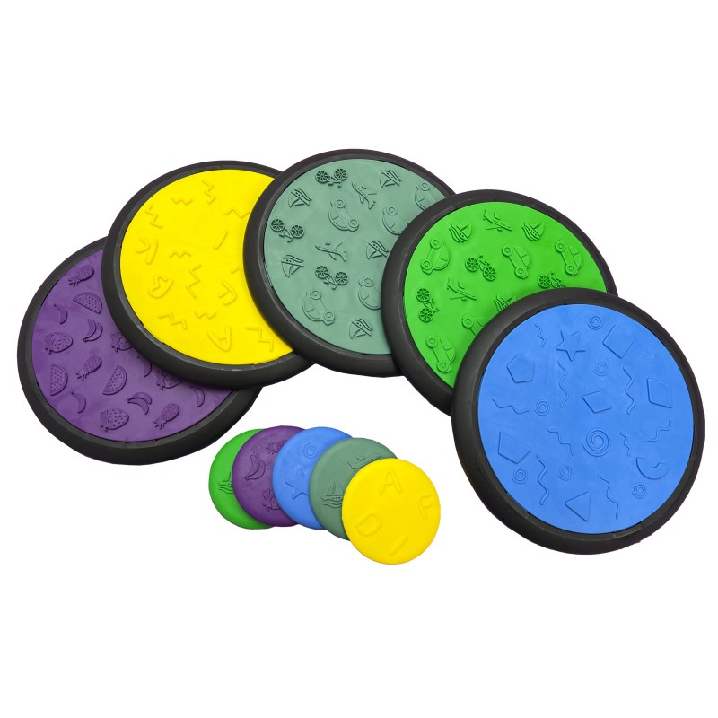 Сенсорні тактильні диски з різною поверхнею нагадують масажні килимки. З ними можна грати в різні ігри, будувати доріжки, розкладати вдома в прохідних місцях для профілактики плоскостопості. Ігри та заняття з сенсорними дисками сприяють фізичному розвитку дитини, розвитку тактильних відчуттів, уваги, тренують м'язи ніг, вчать тримати рівновагу та координувати рухи.
