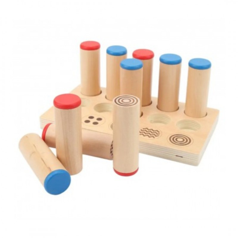 При струшуванні циліндри видають різні звуки. Завдання дитини - знайти циліндри, які звучать однаково, орієнтуючись на слух. Крім того, на дні циліндрів є тактильна поверхня, і дитина повинна за відчуттями вибрати правильний циліндр і вставити його в потрібний рядок.