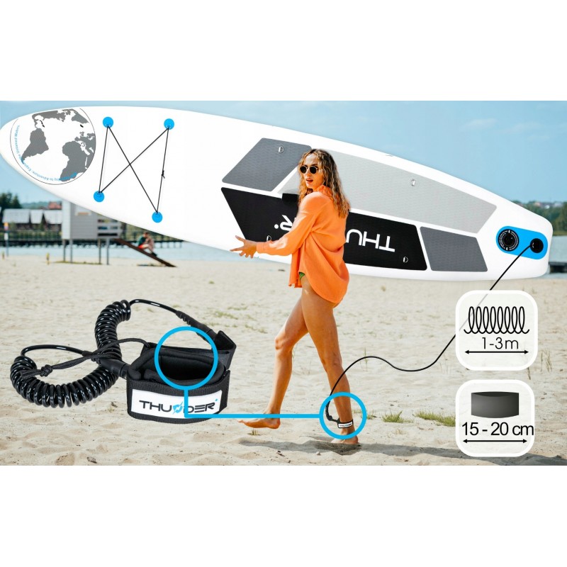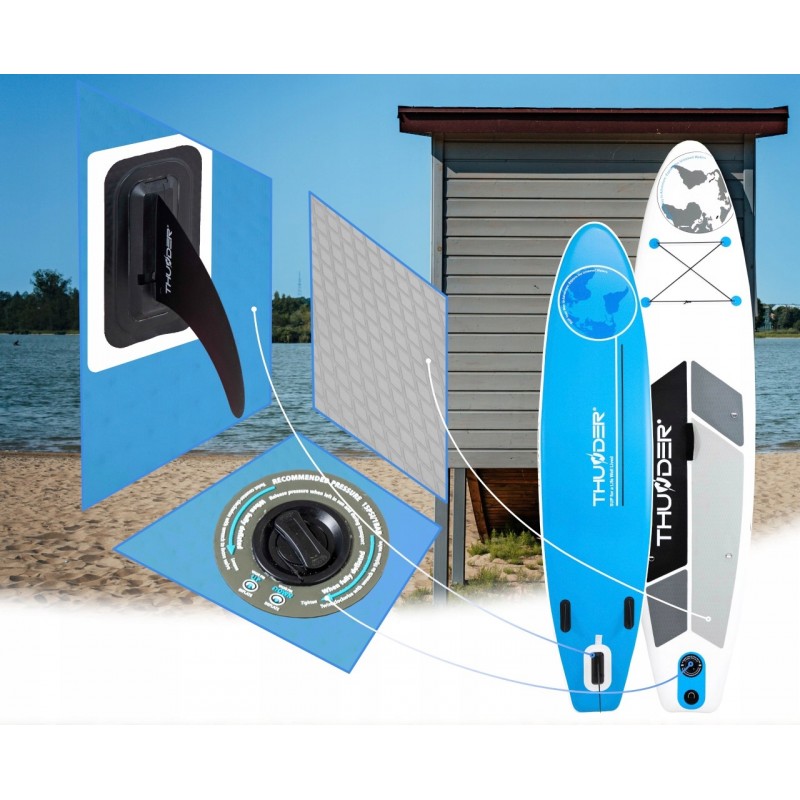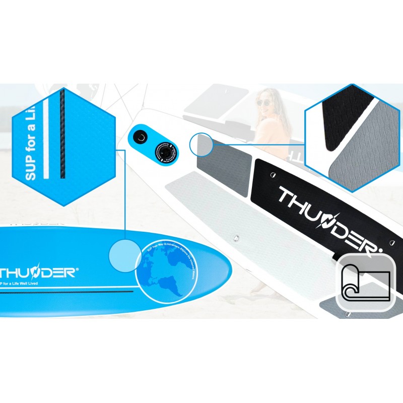 SUP дошка від Thunder виготовлена з високоякісних матеріалів. Конструкція міцна та стабільна завдяки внутрішній структурі виконаній за технологію Ultra Light Drop Stich Core, що підсилює стінки виробу тисячами волокон, додаючи йому жорсткості. Композитне покриття UAL з товстим шаром ПВХ, посилене скловолокном та додатково вкрите 5 мм шаром піни EVA з м’якою, зручною та протиковзкою текстурою, що забезпечує виняткове зчеплення. На передній частині борта розташований багажник, що дозволяє з легкістю закріпити все найнеобхідніше або зафіксувати весло при швартуванні.