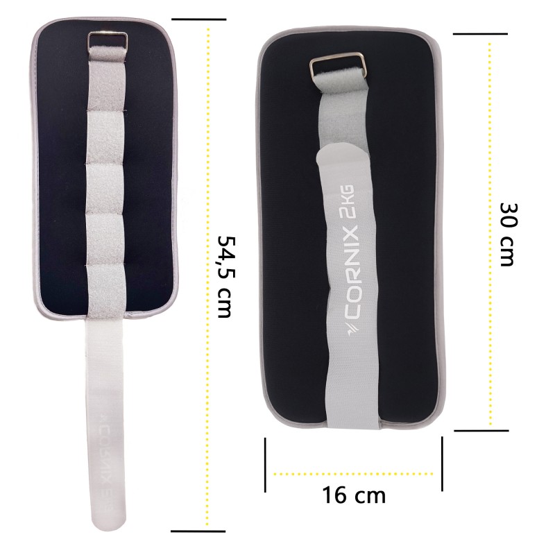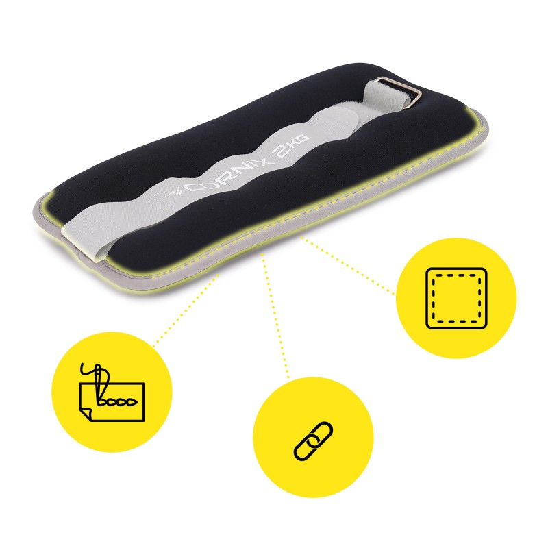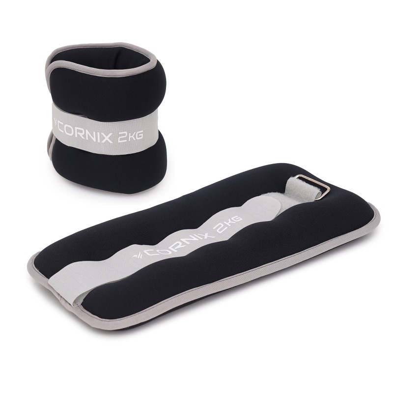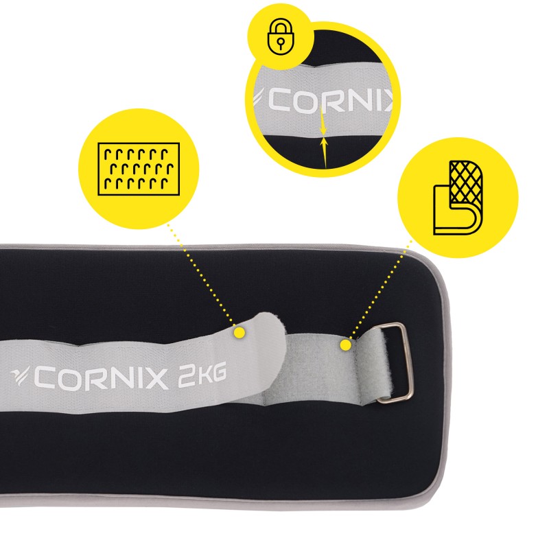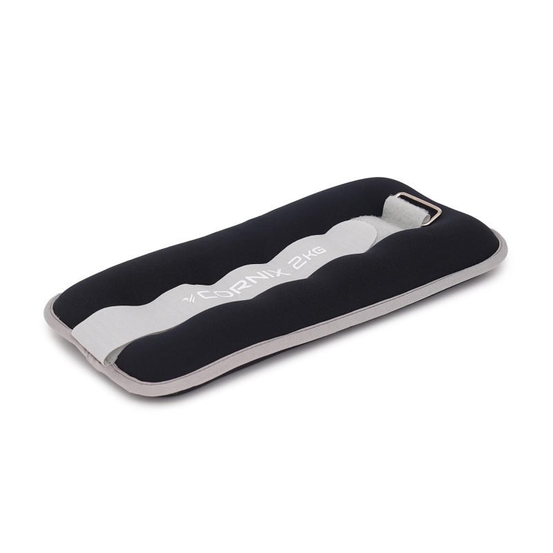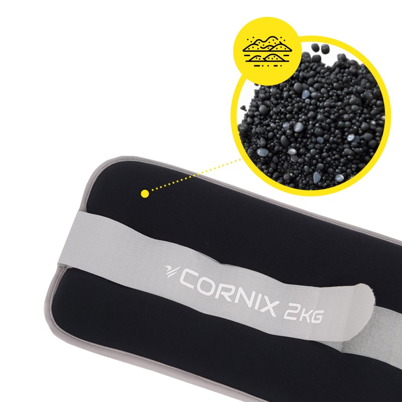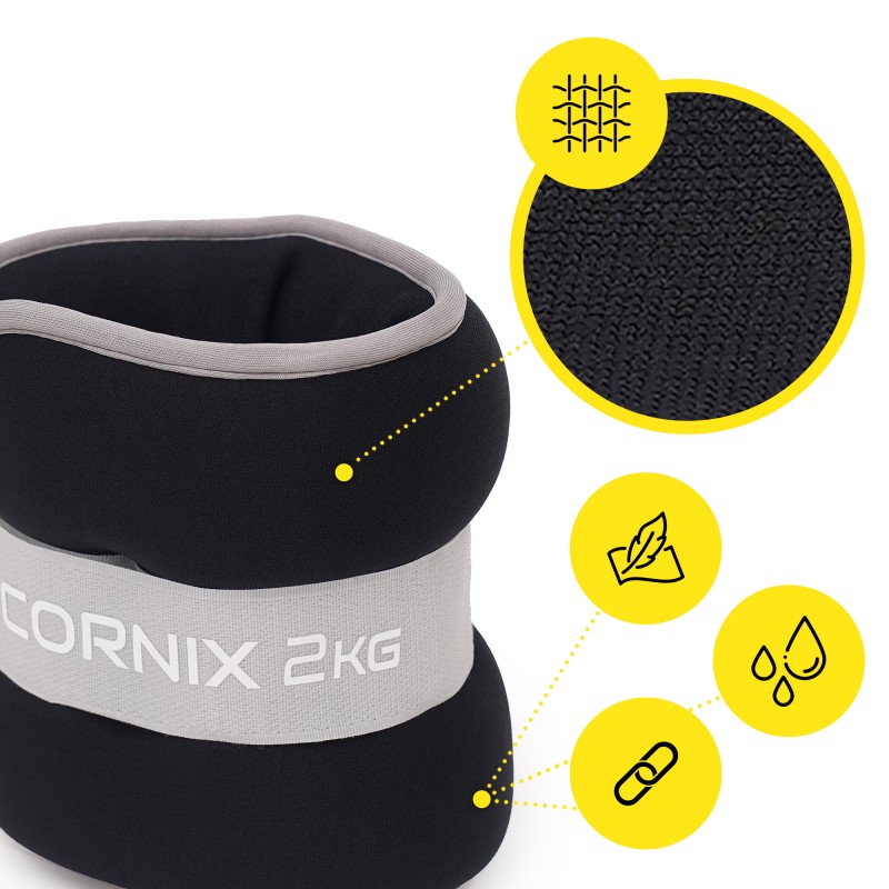 Обважнювачі від Cornix мають продуману форму та виконані з якісних матеріалів. Зовнішня тканина - неопрен, еластична та приємна до тіла. Застібка-липучка дуже проста та надійна, дозволяє припасувати виріб практично до будь-якого обхвату кінцівок. Обважнювачі наповнені залізним піском (iron sand), що гарантує хорошу гнучкість - вони легко адаптуються до форми тіла та мають відмінний баланс - вага рівномірно розподілена по всій довжині. Комплект можна використовувати на двох руках/ногах або збільшити інтенсивність вправ та зафіксувати обидві манжети, наприклад, на одне зап’ястя. В асортименті виробника доступні різні ваги для будь-яких тренувальних цілей.