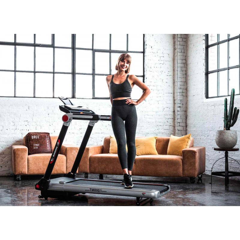 Компактна в складеному стані. Завдяки розумному механізму Складання Easy-Foldable-System бігову доріжку TM 800S можна розкласти та скласти в одну мить, а завдяки висоті 28 см (у положенні лежачи) і глибині 29 см (у положенні стоячи) вона поміститься практично в будь-якому кутку, під ліжком або диваном.