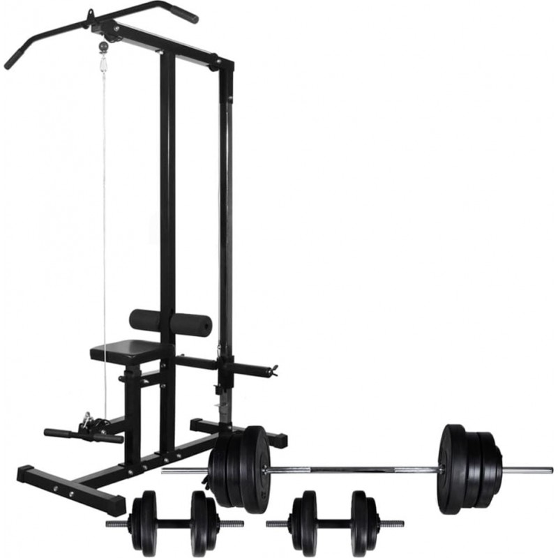 У комплект постачання входять блок, штанга, дві штанги для гантелей, шість пластин по 1,25 кг, чотири пластини по 2,5 кг, чотири пластини по 5 кг, дві пластини по 10 кг, чотири зірочки та два пружинні затискачі.