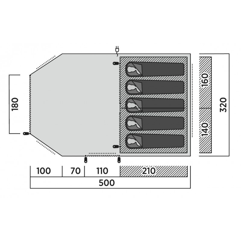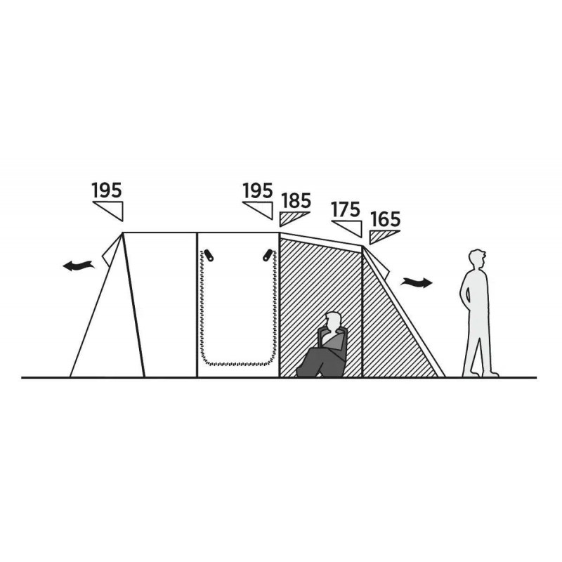 Намет Hamra 5 – це просторий тунельний намет із похилою передньою частиною для максимального збільшення житлового простору. Він має вшиту підлогу для захисту від протягів та комах, великий бічний вхід із повністю сітчастими дверима та внутрішній намет SleepTight із темними стінами внутрішнього намету сприяє швидкому засинанню, а додаткове бокове вікно із закидуваною шторкою та регульована задня вентиляція підтримують комфортний мікроклімат усередині.