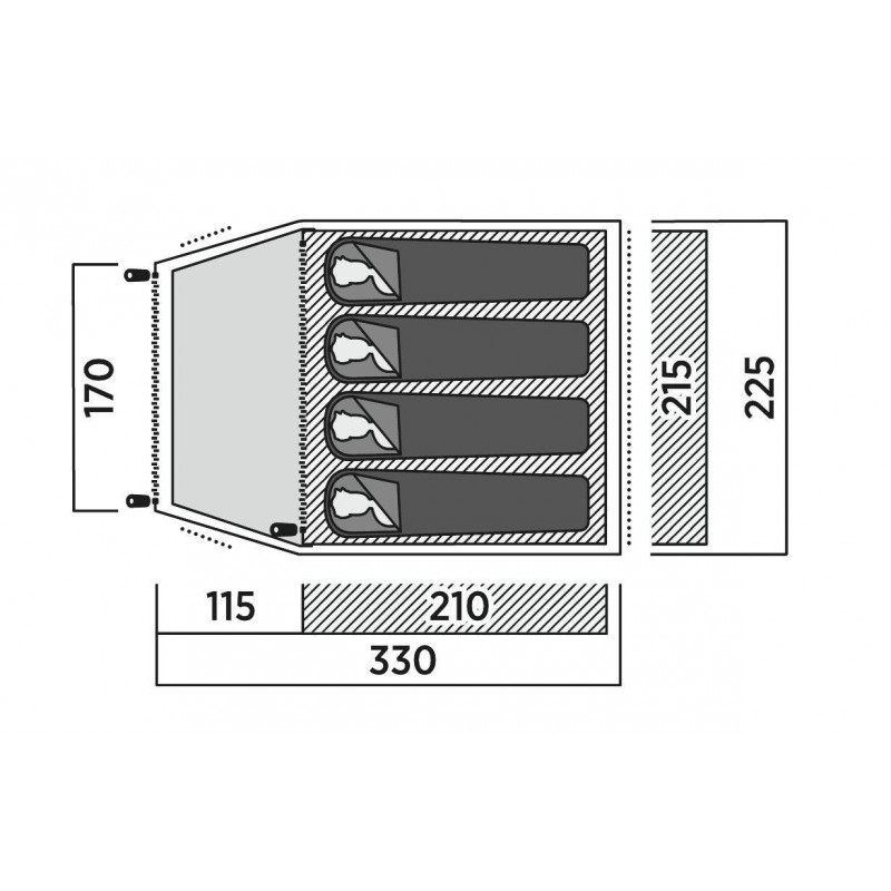 - Зовнішній тент: WeatherGuard 2000, 180T поліестер із PU-покриттям, без PFC, вогнестійкий