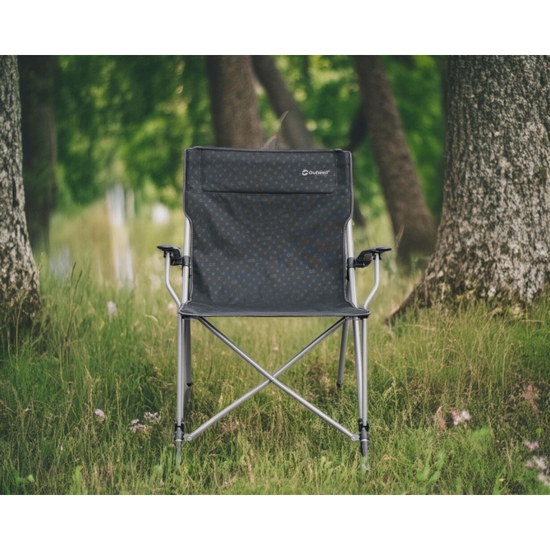 Стілець розкладний Outwell Goya - розкладний стілець із широкими підлокітниками та міцним каркасом, виготовленим із високоміцної сталі з порошковим фарбуванням. Модель витримує навантаження до 125 кг та має чохол для перенесення, що полегшує транспортування та забезпечує компактне зберігання, коли стілець не використовується. Шикарна, але водночас витончена поліефірна тканина з тисненням логотипу додає комфорту та стилю.