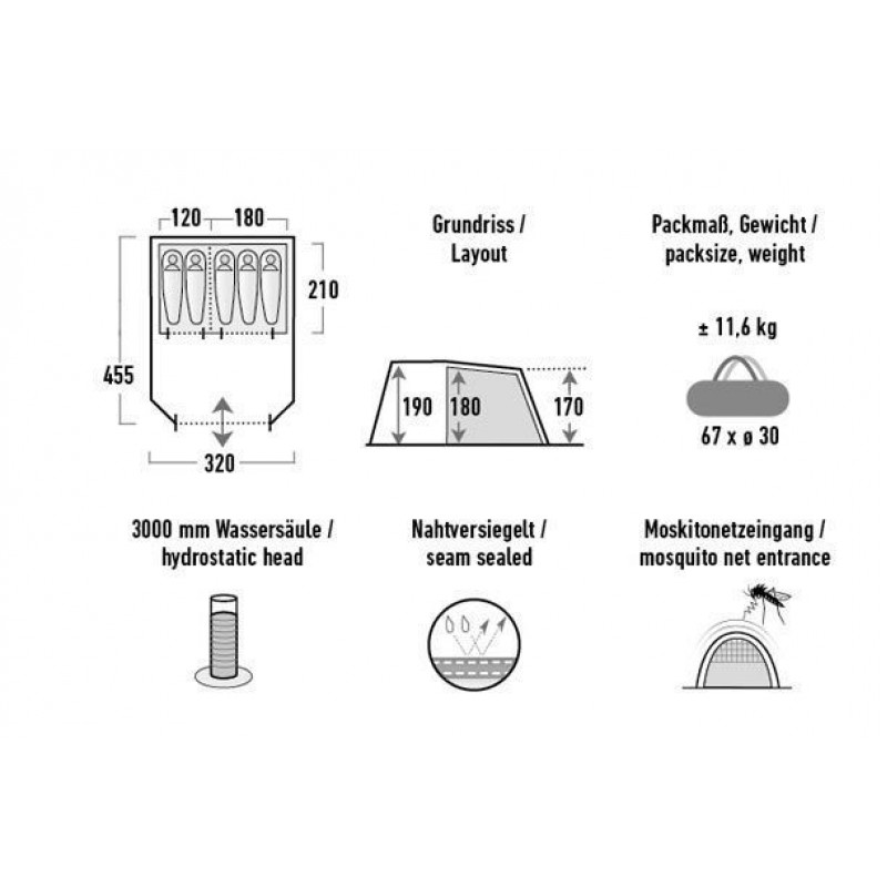 Пʼятимісний намет High Peak Torri 5.0 – це просторий тунельний намет із продуманими функціями та швидким складанням, підходить для сімей та невеликих груп. Водонепроникне покриття та герметичні шви забезпечують надійний захист за будь-якої погоди. Прошита підлога намету запобігає потраплянню бруду та вологи, а житлова зона з висотою 2 м пропонує багато місця для багажу та відпочинку. Два прозорі вікна зі шторами та два сітчастих вікна забезпечують денне світло та приватність. Три системи постійної вентиляції та москітні сітки гарантують приємний клімат у приміщенні – навіть під час дощу. Завдяки 5 внутрішнім кишеням, 5 органайзерам та тримачу для лампи, порядок та комфорт також забезпечені. Знімна перегородка робить внутрішній намет гнучким у використанні. Ідеально підходить для свят, поїздок на вихідні чи фестивалів.