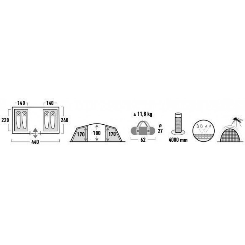 High Peak Tauris 4 Dark Grey/Green (11560) - чотиримісний тунельний намет із дзеркально розташованими роздільними спальнями. Два протилежні входи забезпечують зручний доступ усередину. Завдяки опорним вертикальним стійкам, фронтальні двері можуть бути використані як навіс від сонця. Переднє вікно в житловій зоні виконане з прозорого ПВХ і призначене для доступу світла, а заднє з москітної сітки - для додаткової вентиляції. Знімна підлога в тамбурі захищає від вогкості, а одну зі спалень можна не встановлювати, щоб збільшити внутрішній простір. Двері внутрішніх наметів виконані з москітної сітки для кращої вентиляції та захисту від комах. High Peak Tauris 4 Dark Grey/Green (11560) - ідеальний намет для відпочинку в кемпінговому таборі з сім'єю чи друзями.