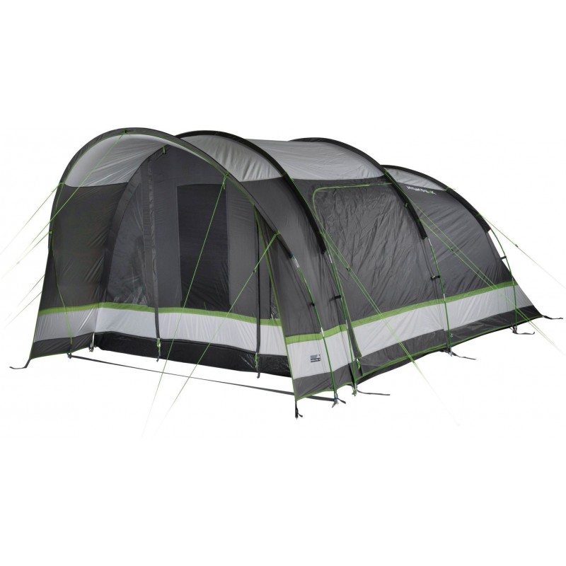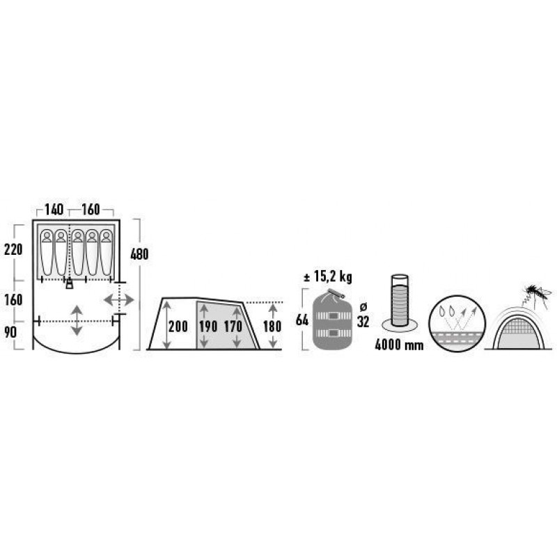 High Peak Brixen 5.0 Light Grey/Dark Grey/Green (11816) - чотиримісний тунельний намет із двома входами, вітальнею зі вшитою підлогою, що забезпечує захист від настирливих комах та небажаних протягів. Інтегрований навіс створює тінь і допомагає запобігти попаданню дощу всередину під час відчинення дверей. Житлова зона з висотою стелі 1,9 м має достатньо місця для розміщення кемпінгових стільців, столу та похідного спорядження. Сітчасте вікно зі шторою на передніх дверях забезпечує постійний приплив свіжого повітря в намет. Бічні сітчасті двері збільшують приплив свіжого повітря і захищають від комах. Прозорі вікна у житловій зоні наповнять приміщення світлом, а штори за необхідності забезпечать усамітнення. Дах має тепловідбивне алюмінізоване покриття, що знижує підвищення температури всередині намету вдень у сонячну погоду.