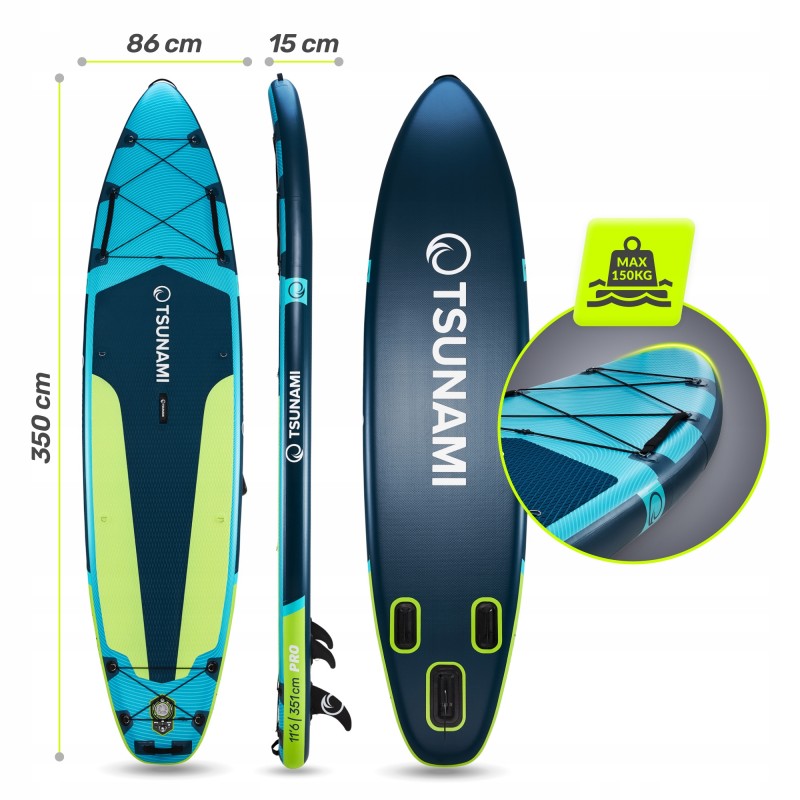 Надувна SUP дошка серії Pro від польського бренду Tsunami - ідеальний вибір для тих, хто мріє про пригоди на воді! Вона відмінно підходить як для новачків, так і для досвідчених ентузіастів. З сапбордом ви зможете досліджувати озера, річки або морські узбережжя, насолоджуючись свободою руху та тренуючи все тіло. Довжина 350 см забезпечує стабільність і легке маневрування, а міцний двошаровий матеріал робить її стійкою до пошкоджень та перепадів температур. У комплекті - все необхідне: регульоване весло, помпа, страхувальна линва, ремонтний набір та рюкзак для транспортування. Навіть якщо ви ніколи не стояли на SUP-дошці - Tsunami стане вашим надійним партнером у світі водного спорту!
