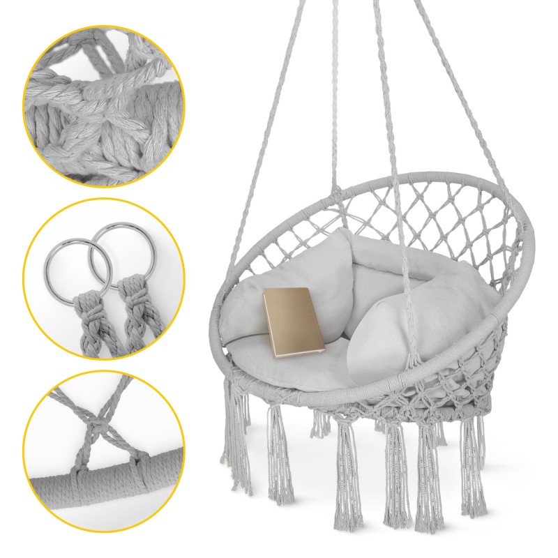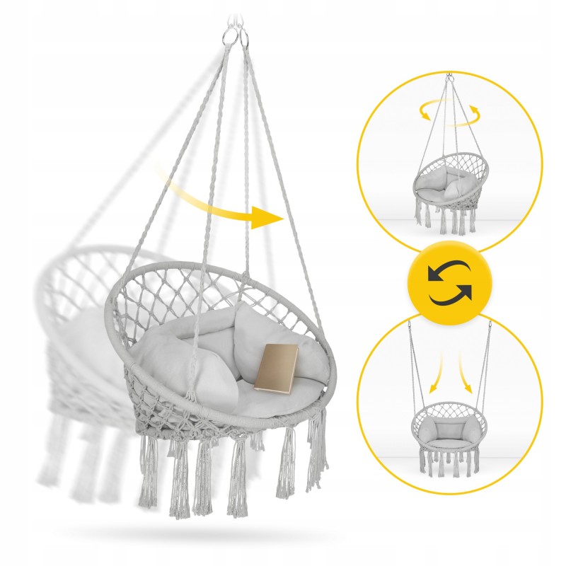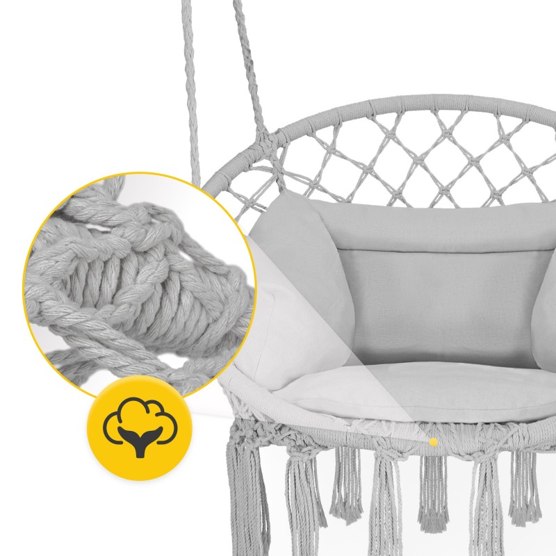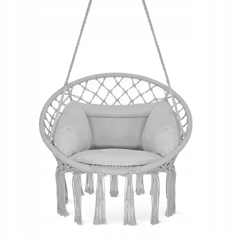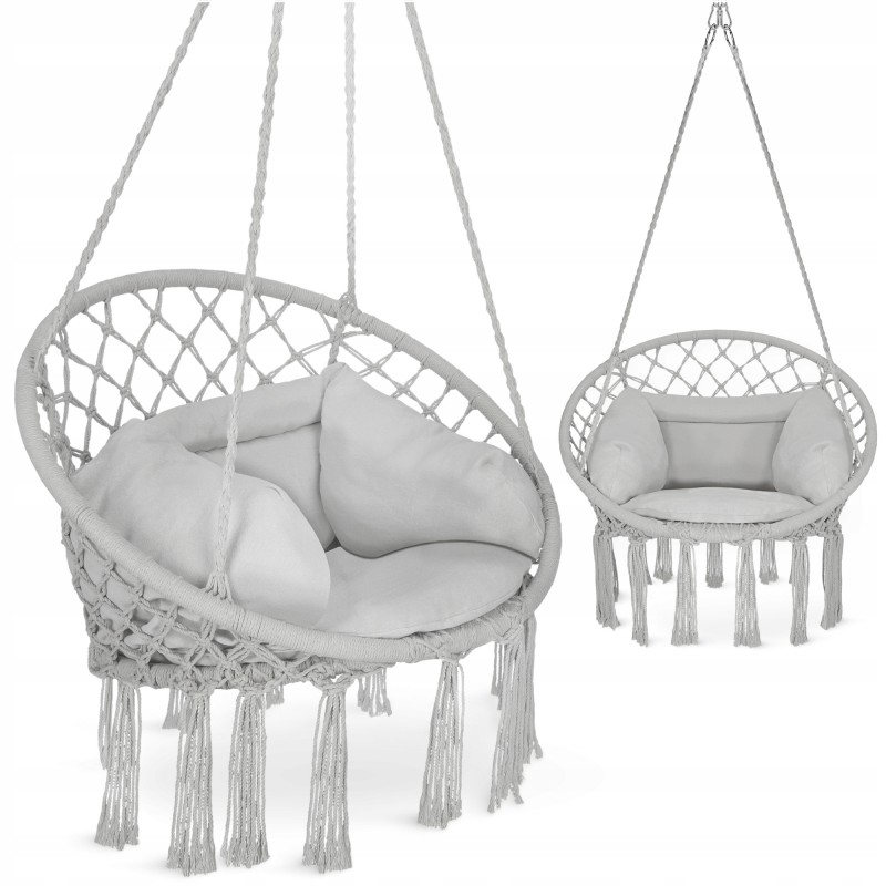 Крісло-гойдалка Boho Dream з подушкою від польського бренду 4Fizjo - це ваш квиток до світу спокою та естетики! Дане підвісне крісло в стилі бохо стане серцем вашої зони відпочинку, де ви зможете читати улюблені книжки, пити ранкову каву або просто насолоджуватися легким гойданням. Виконане з натуральної бавовни та поліестеру, воно поєднує міцність, комфорт і екологічність. Приємна колірна гама, м'яка подушка, ажурне плетіння у техніці макраме та декоративні китиці додають йому неперевершеного шарму, який підкреслить інтер'єр вітальні, тераси, балкона або саду. Створіть власний оазис для медитації, романтичних вечорів або ігор з дітьми - Boho Dream впорається з усім!